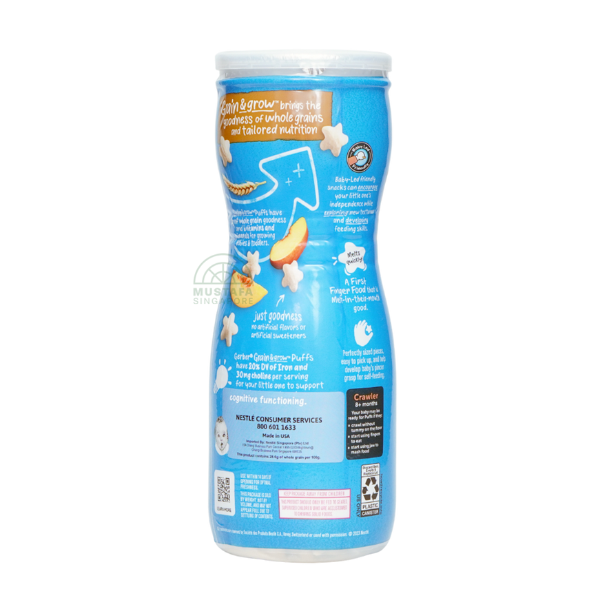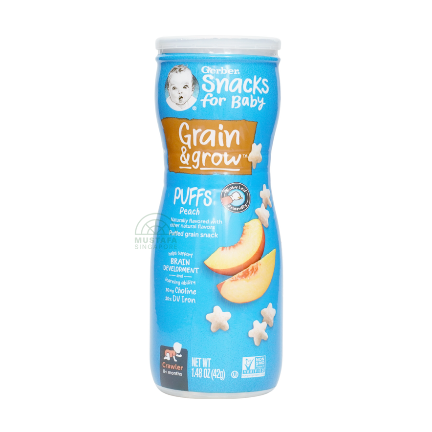 Gerber Snacks for Baby Grain & Grow Puffs Peach 42g are soft, easy-to-eat puffs made with real peach and whole grains. Ideal for babies 8 months and older, they provide essential nutrients for healthy growth and brain development.