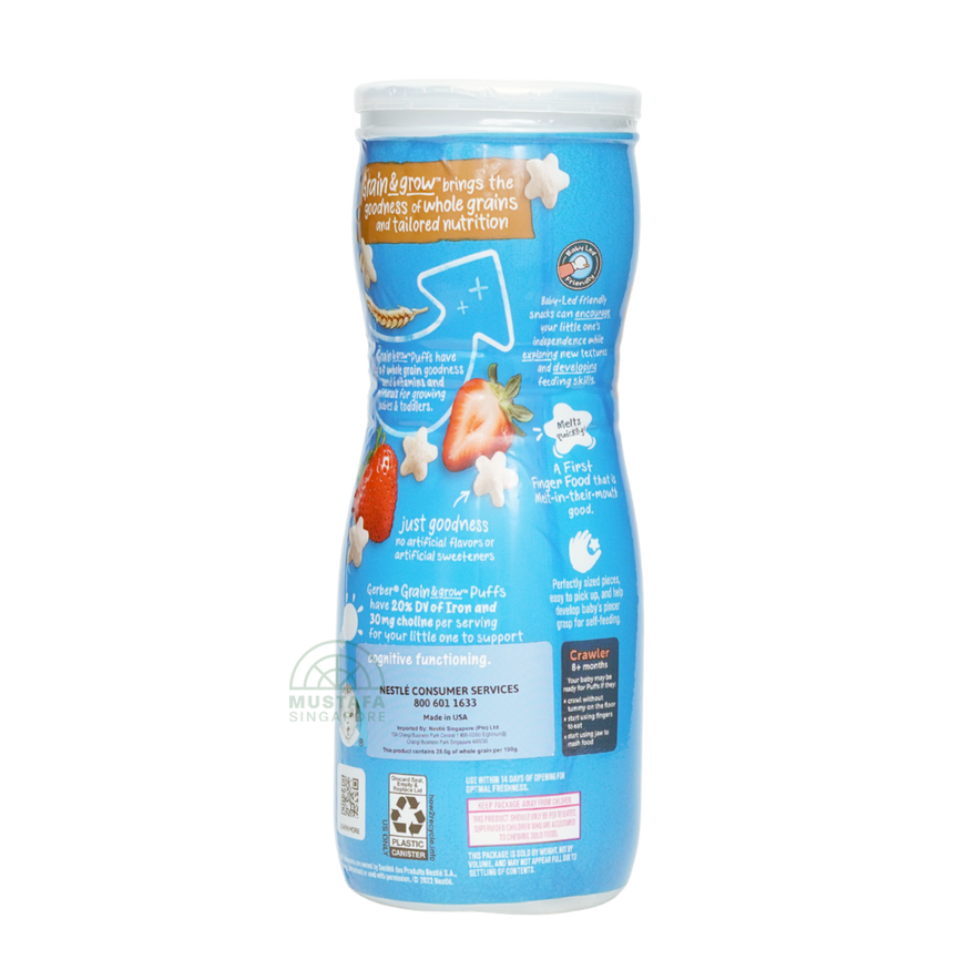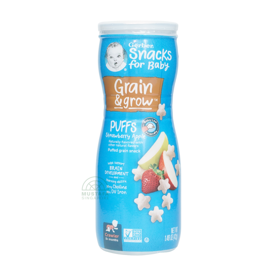 Gerber Snacks for Baby Grain & Grow Puffs Strawberry Apple 42g combine real strawberry and apple flavors in light, crunchy puffs. Suitable for babies 8 months and older, they promote growth and fine motor skill development while offering a naturally sweet taste.
