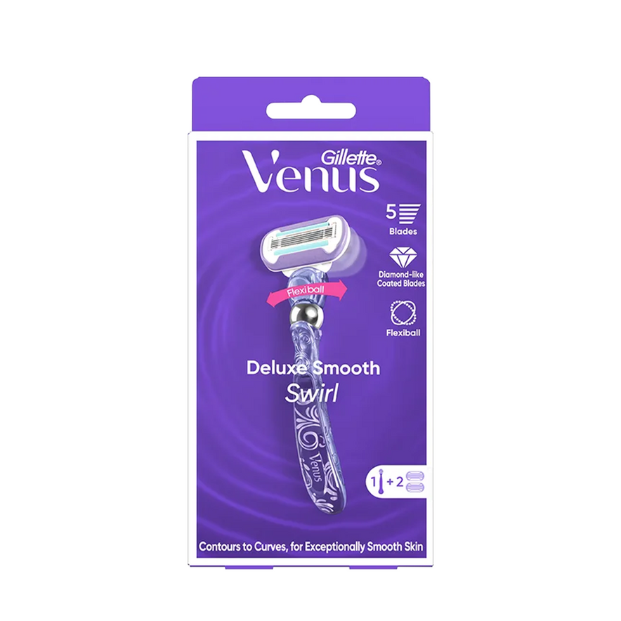 Achieve a close and comfortable shave with the Gillette Venus Deluxe Smooth Swirl Razor 2up. Designed for optimal glide, this razor features five ultra-thin blades and a flexible moisture ribbon that adapts to your curves, reducing irritation and leaving your skin soft. The ergonomic handle ensures precise control, while the smooth, swirling design adds comfort and elegance to your daily grooming routine.