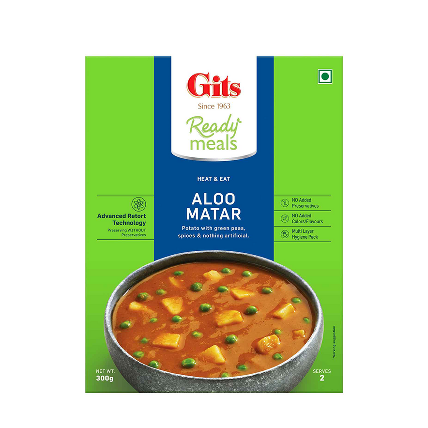 Potatoes, green peas, tomato, onion, edible vegetable oil, ginger, garlic, green chilli, cumin, coriander, turmeric, salt, spices