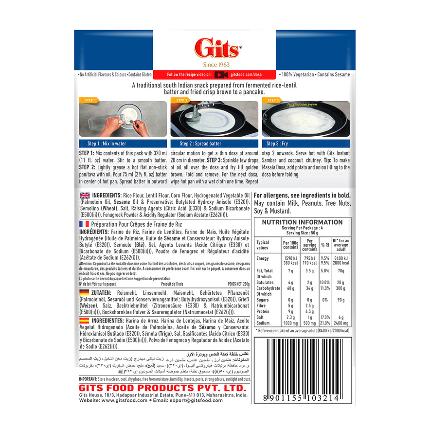 Gits Dosa Instant Breakfast Mix 200g offers a quick and convenient way to enjoy authentic South Indian dosas at home. Made with a blend of rice and lentils, this ready-to-cook mix delivers crisp, golden dosas in minutes—just add water, mix, and cook. Perfect for a wholesome breakfast or light meal, it combines traditional taste with modern convenience.