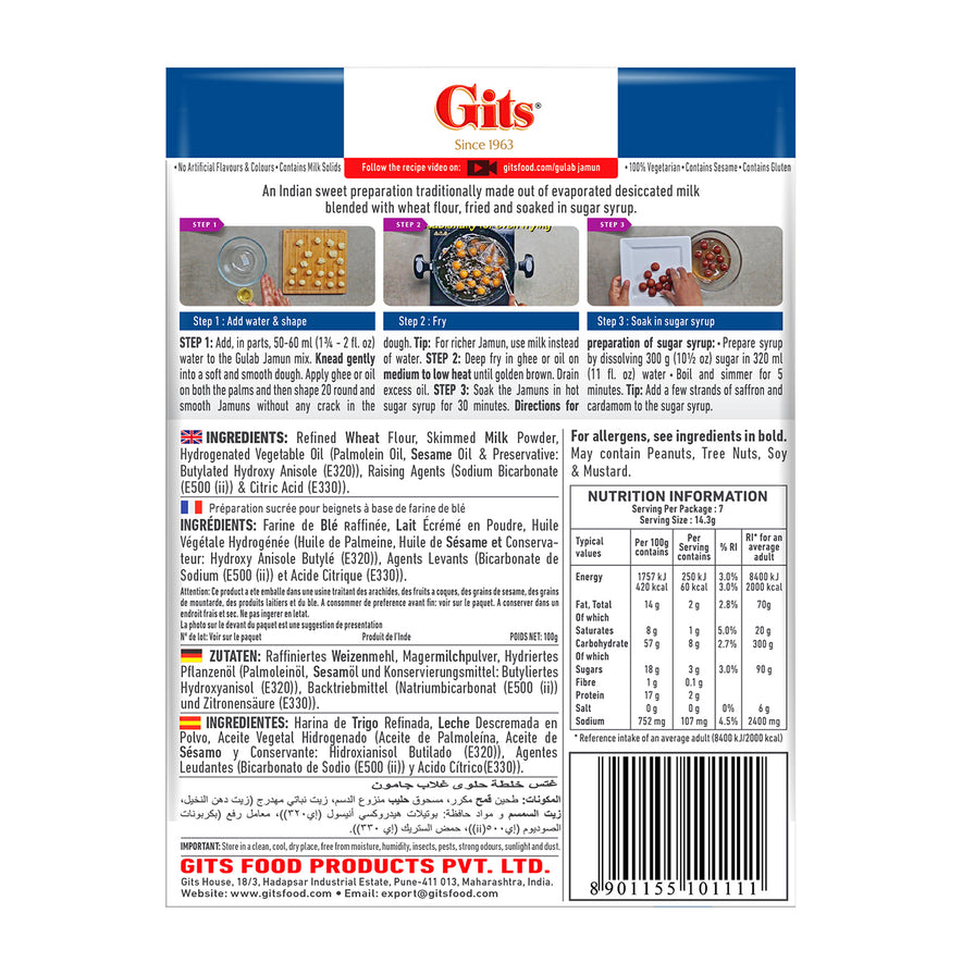 Gits Gulab Jamun Dessert Mix 100g lets you make soft, spongy, and sweet Indian gulab jamuns quickly and easily at home. Made with a traditional blend of ingredients, this ready-to-cook mix ensures perfectly round, syrupy treats every time. Ideal for festive occasions, celebrations, or a delightful sweet snack anytime.