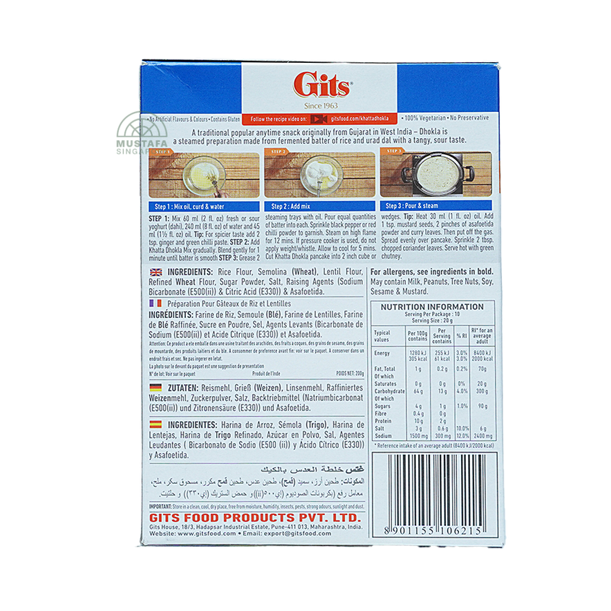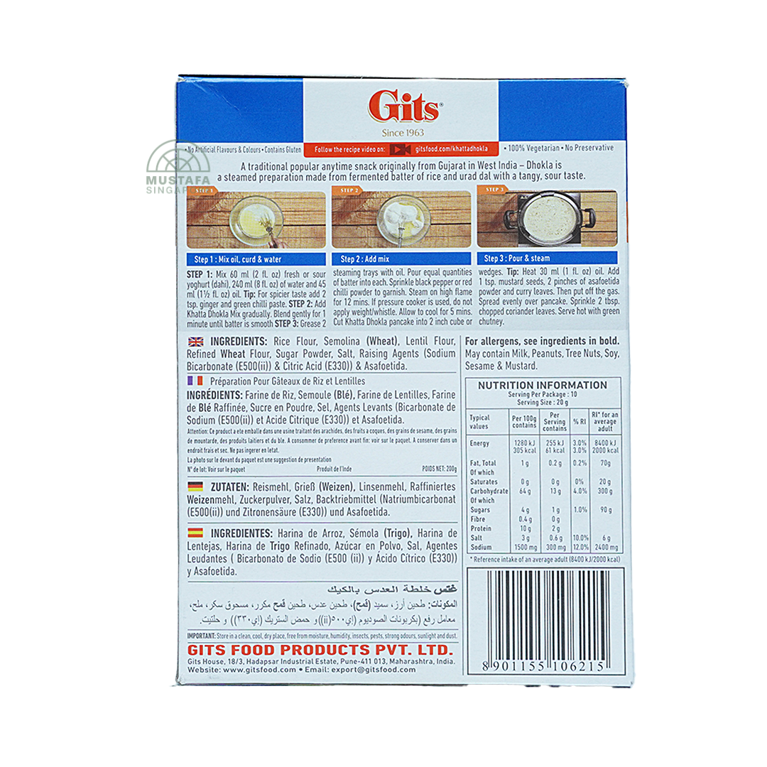 Gits Khatta Dhokla 200g is a convenient mix to make soft, tangy, and spongy Khatta Dhokla at home. Quick to prepare, it's perfect for a light snack or breakfast, delivering the authentic taste of traditional Indian cuisine in every bite.