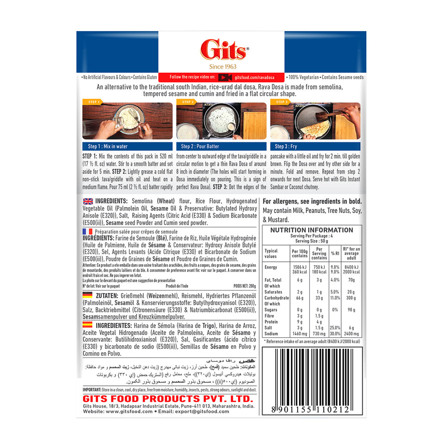 Gits Rava Dosa Instant Breakfast Mix 200g makes it simple to prepare authentic South Indian rava dosas in minutes. Crafted with semolina, rice, and spices, this ready-to-cook mix gives you thin, crisp, and golden dosas with a delightful flavor. Just add water, mix, and cook for a quick, tasty breakfast or snack anytime.