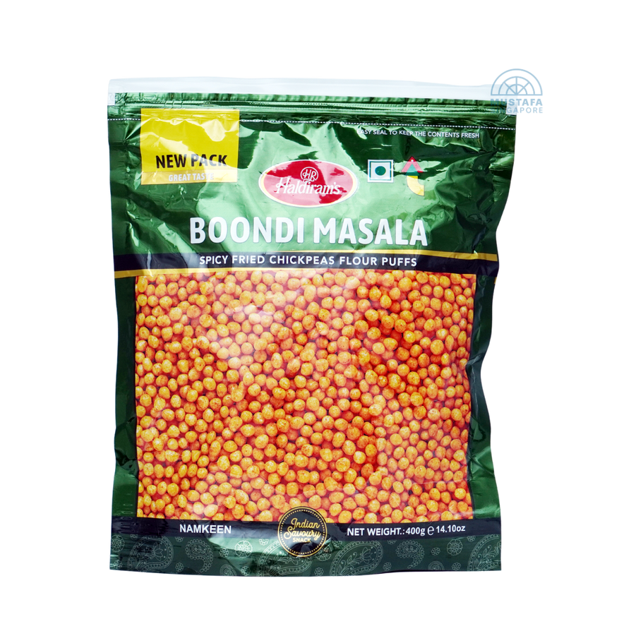 Haldiram's Boondi Masala is a larger pack of crunchy gram flour pearls coated with masala seasoning. Bold and aromatic, it is suitable for family sharing.