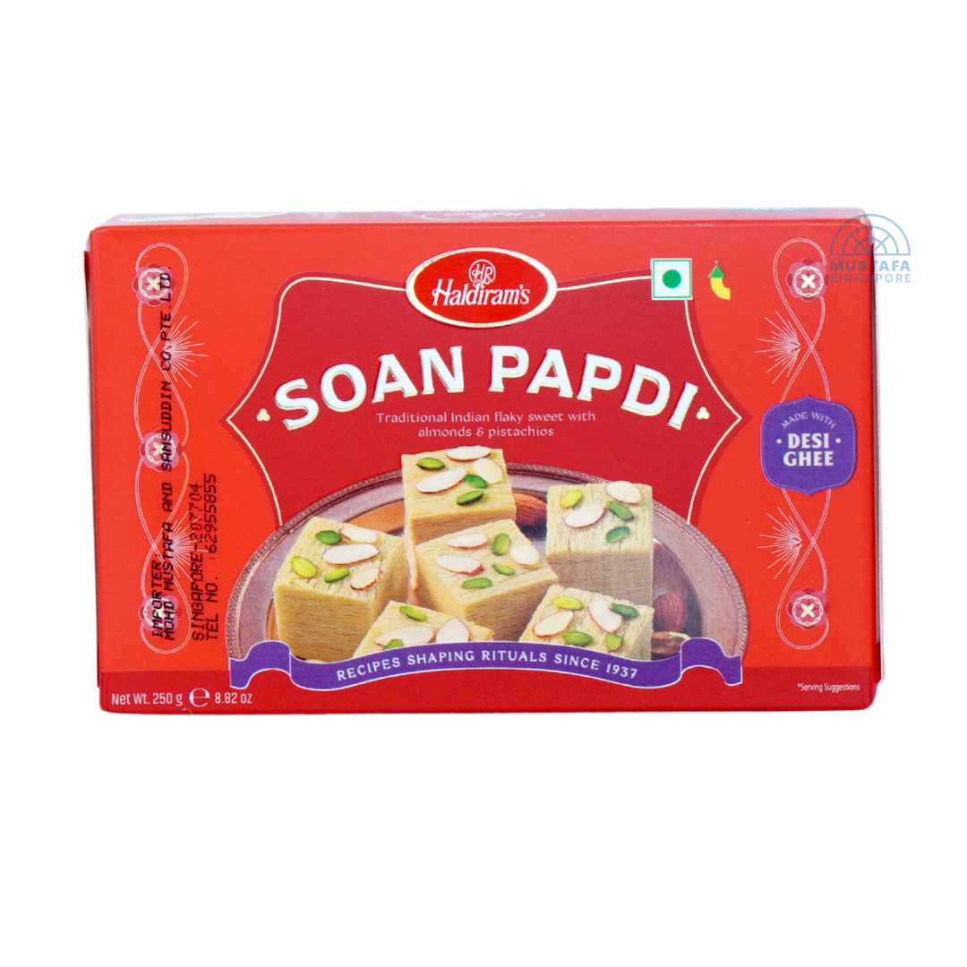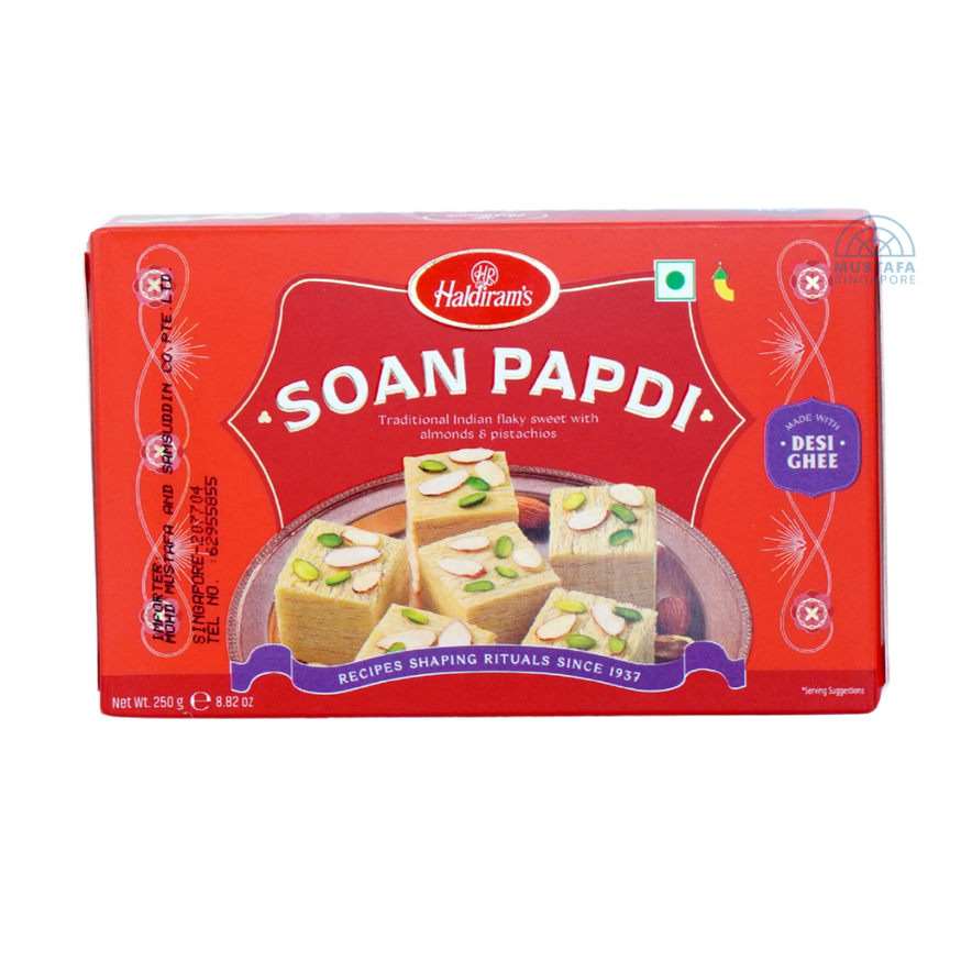 Haldiram's Soan Papdi is a traditional Indian flaky sweet made from gram flour, ghee, and sugar. Light and melt-in-the-mouth, it is popular during festive occasions.