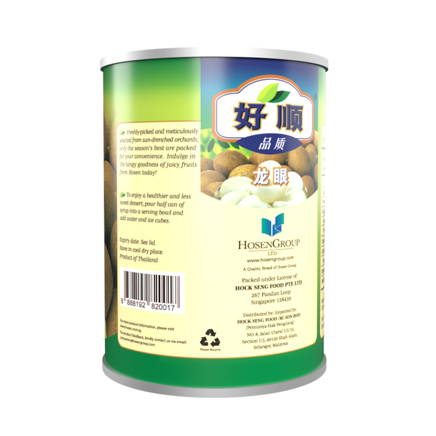 Hosen Longan in Syrup 565g provides plump, juicy longan fruit in syrup, ideal for desserts, fruit cocktails, and tropical drinks.