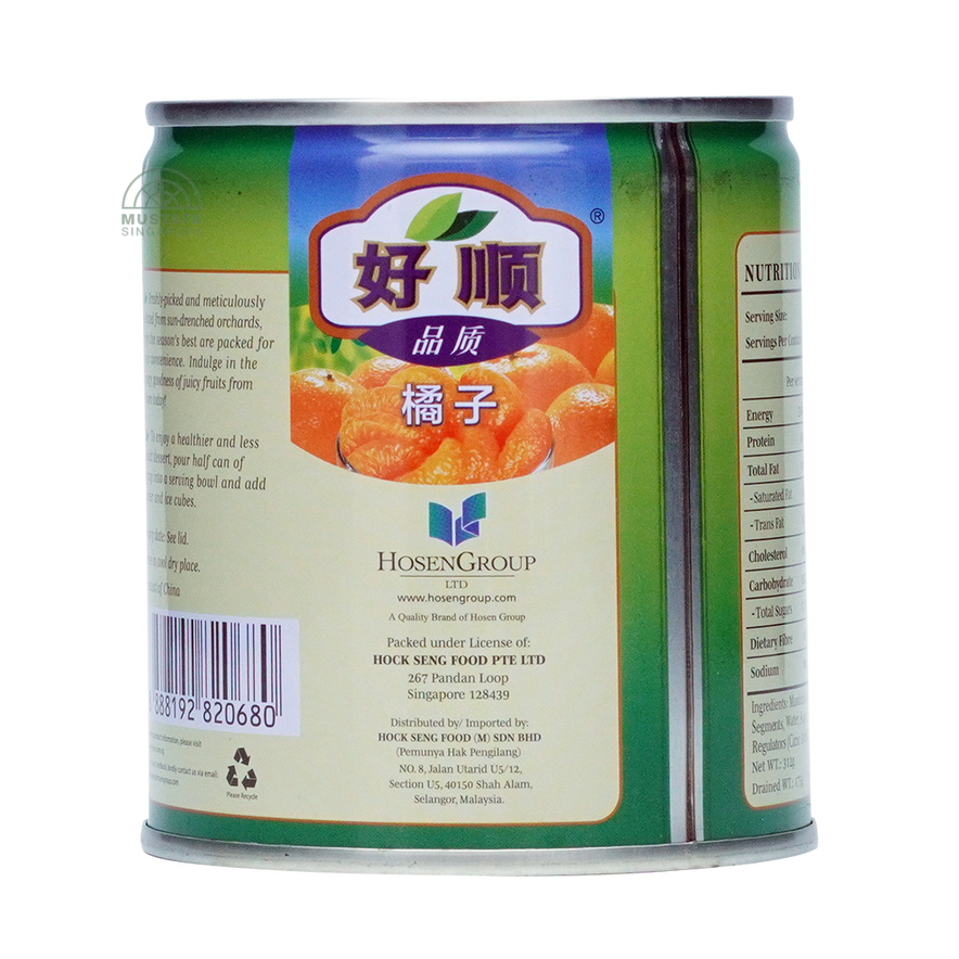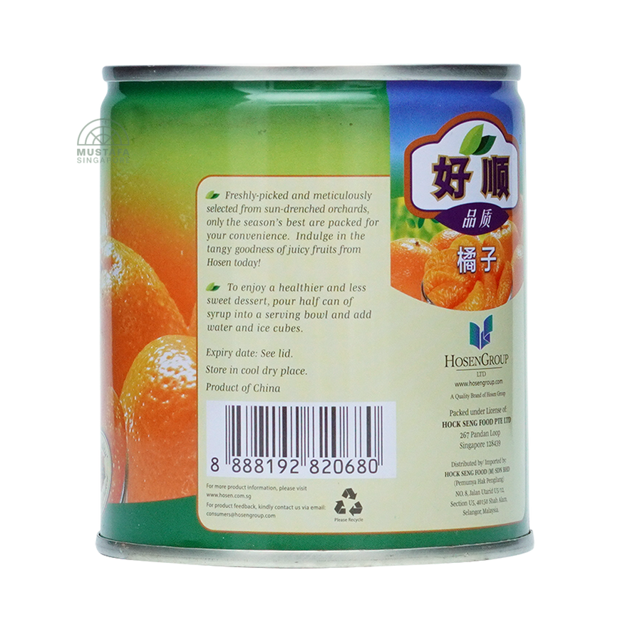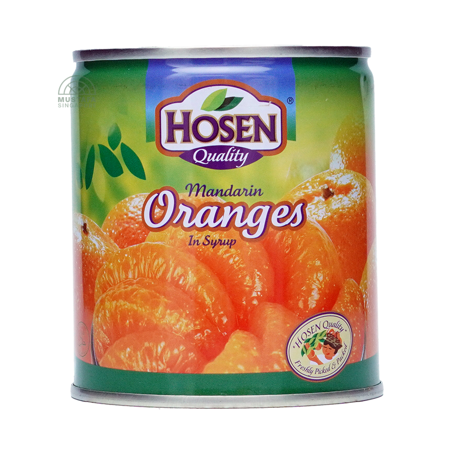 Hosen Mandarin Oranges in Syrup 312g delivers sweet, juicy mandarin orange segments in light syrup, perfect for desserts, fruit salads, and beverages.