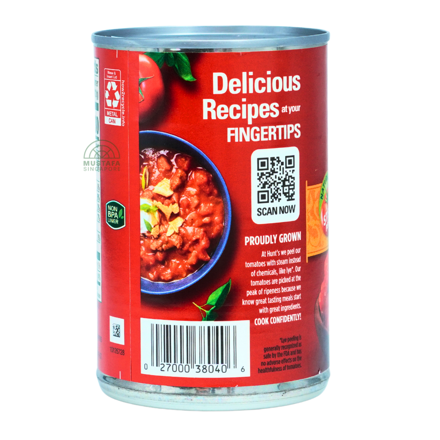 Hunt's Diced Steamed Peeled Tomatoes are made from vine-ripened tomatoes, steam peeled and diced to preserve their natural taste and freshness. Packed in tomato juice, they are ideal for pasta sauces, soups, stews, and casseroles.