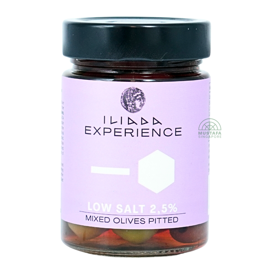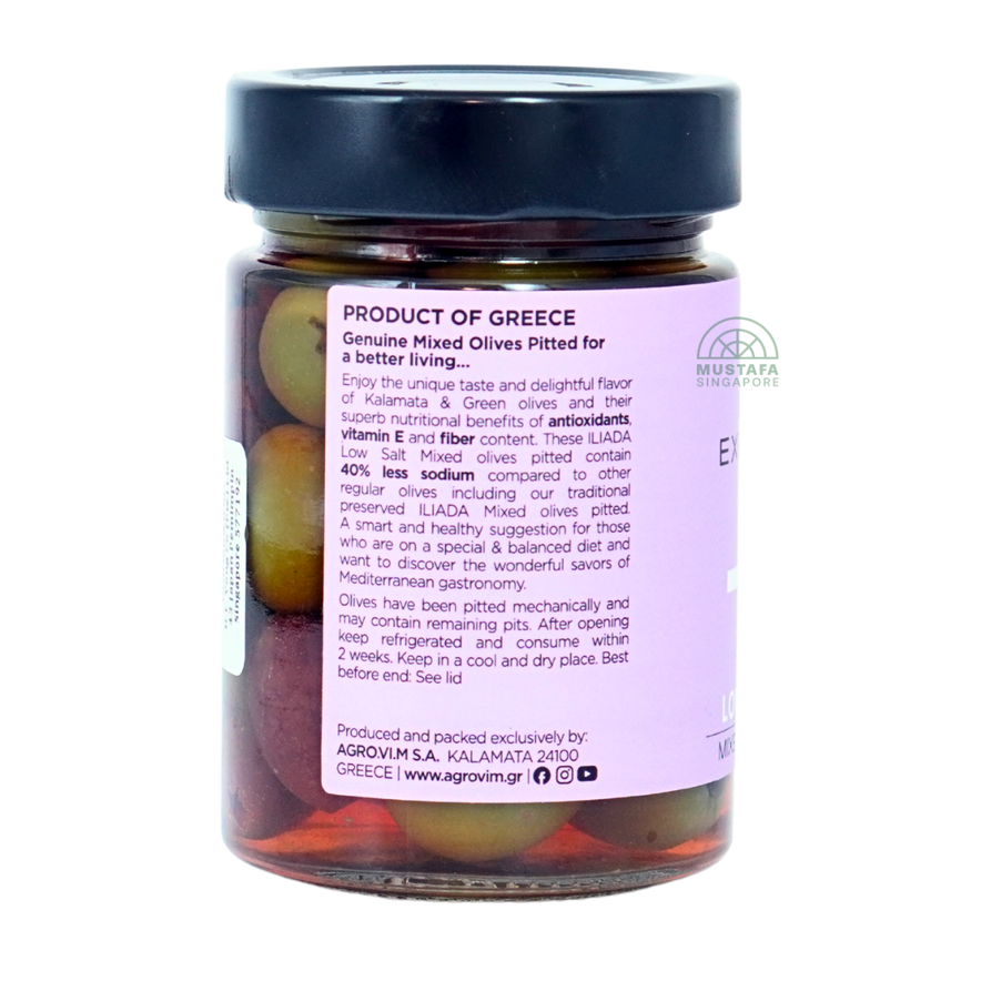 Delicious Iliada Low Salt Mixed Pitted Olives 370g combines green and black olives with reduced salt for a healthier Mediterranean snack or salad ingredient.