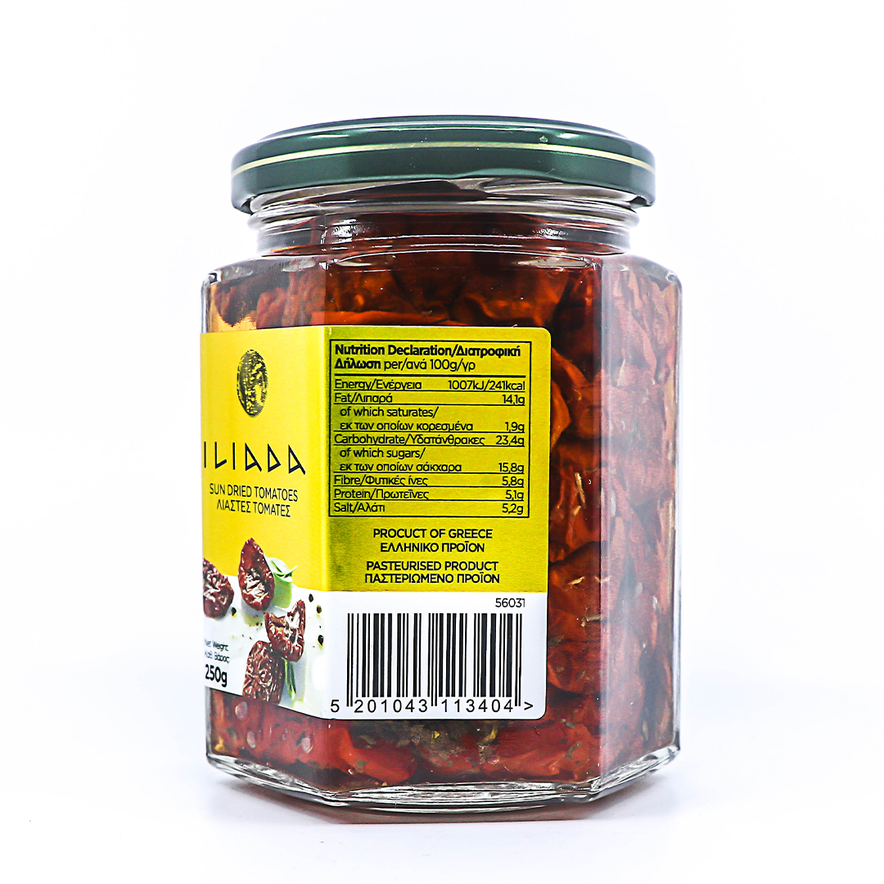 Sweet and tangy Iliada Sun Dried Tomatoes 250g are naturally dried under the sun for concentrated flavor. Perfect for pasta, salads, antipasto, or cooking.