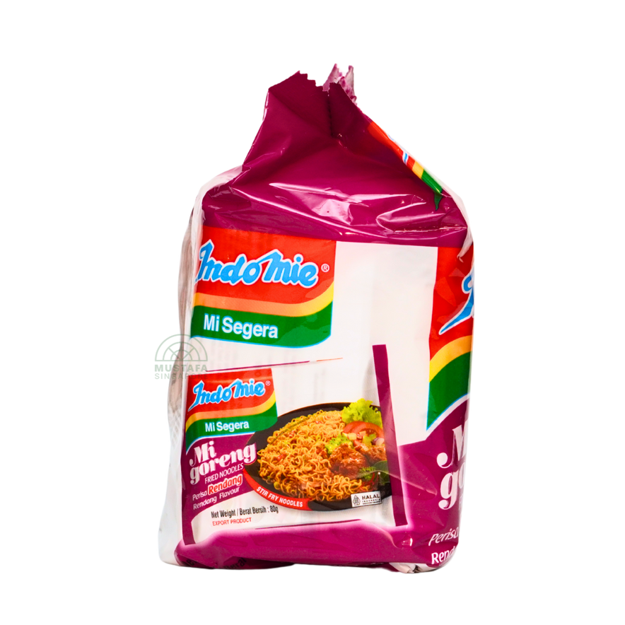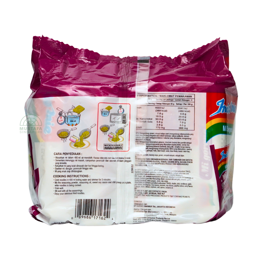 Noodles: Wheat flour, refined palm oil (contains antioxidant E319), salt, acidity regulators (E452, E501, E500), thickener (E412), color (E101). Seasoning powder: Sugar, salt, flavor enhancers (E621, E627, E631), soybean-containing flavoring, garlic, color (E105a), yeast extract, white pepper. Seasoning oil: Refined palm oil (contains antioxidant E319), shallot, chili, garlic, galangal, ginger, turmeric leaves, lemongrass, lime leaves, turmeric, bay leaves, color (paprika extract), curry flavoring. Sweet soy sauce: Sugar, water, salt, wheat, soybean, spices, sesame oil, chili powder.