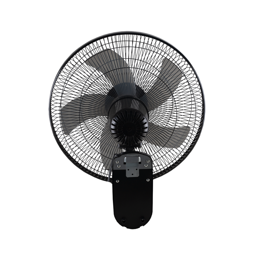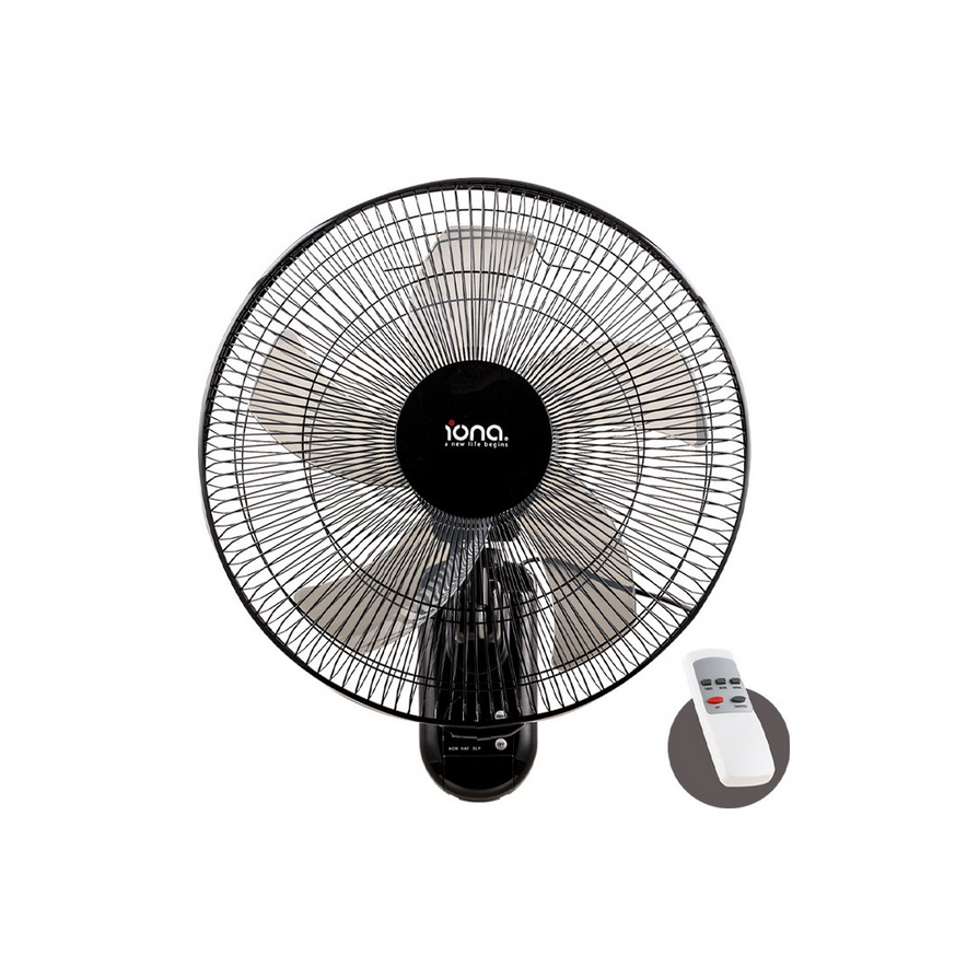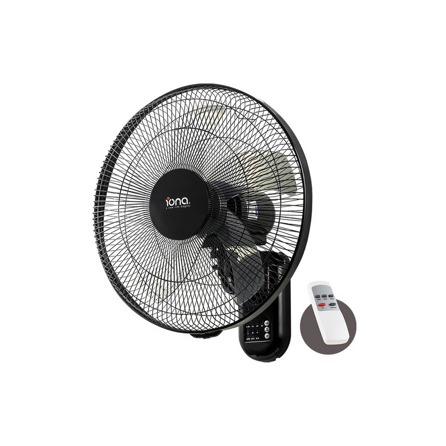 Iona 16" Wall Fan with Remote Control features 5 piece fan blade, 3 speed pull string control, 90 degree wide angle oscillation, adjustable tilt angle and whisper quiet motor
