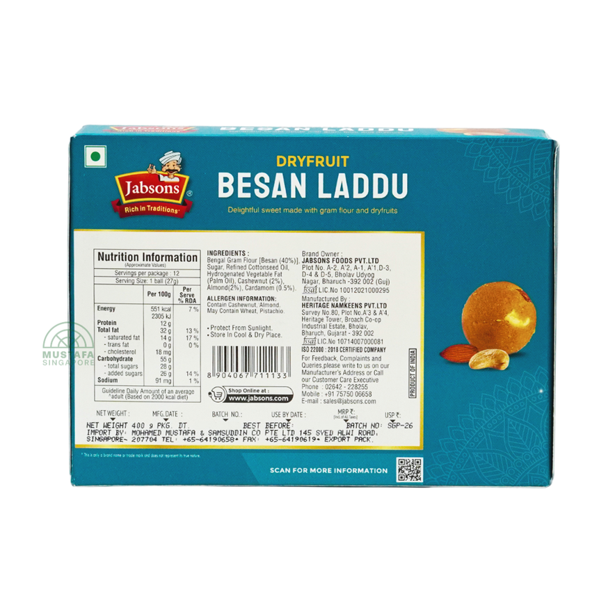 Jabsons Besan Laddu is a traditional Indian sweet crafted from high-quality gram flour (besan), pure desi ghee (clarified butter), and sugar, infused with aromatic cardamom. These laddus are known for their melt-in-the-mouth texture and rich, nutty flavor, making them a popular choice during festivals and special occasions. Each 400g pack contains approximately 10-12 laddus, perfect for sharing with family and friends.