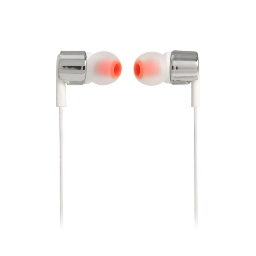 The JBL T210 In-Ear Headphones combine sleek metallic design with powerful JBL Pure Bass sound. Equipped with premium 8.7mm drivers, they deliver deep, punchy bass and clear audio quality. The tangle-free flat cable includes a one-button remote with a built-in microphone for easy music control and hands-free calling, making them ideal for daily use.