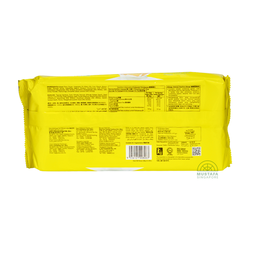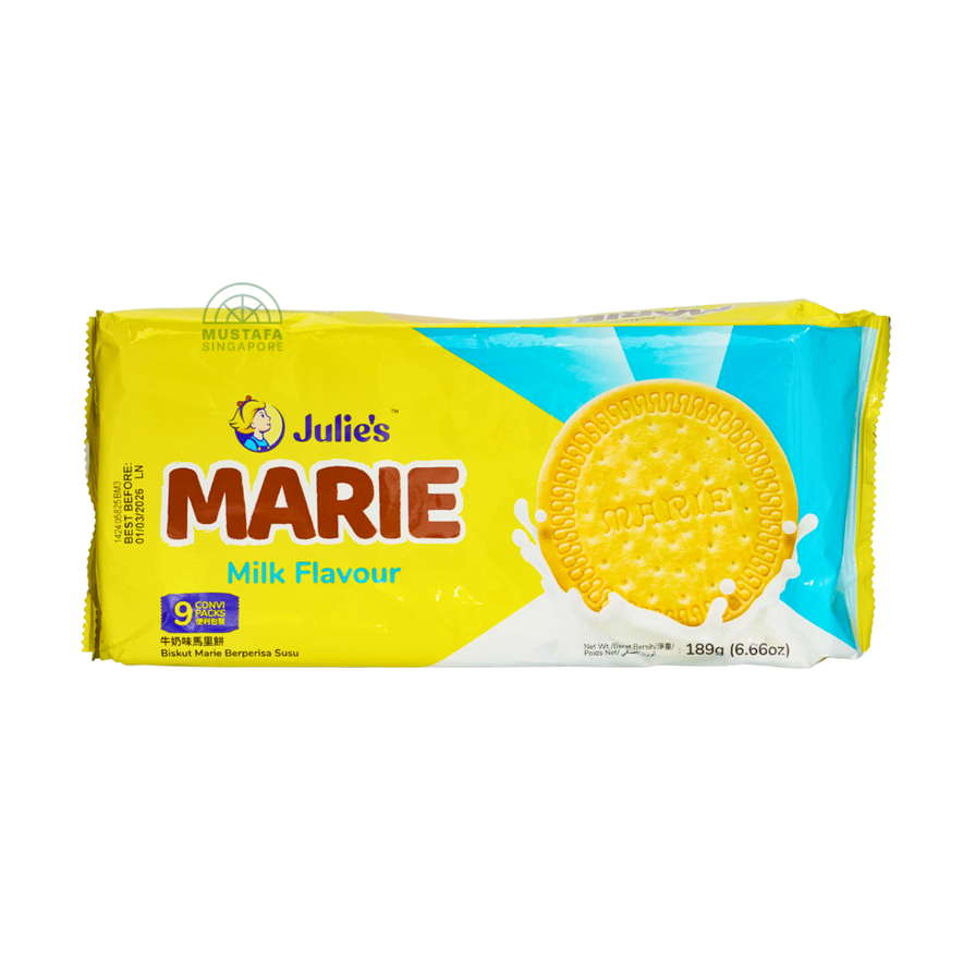 Delight in the timeless taste of Julie's Marie Milk Biscuits. A classic snack that combines a crisp texture with a gentle, milky sweetness. Each biscuit is delicately baked to perfection, offering a satisfying crunch that pairs wonderfully with tea or coffee. Packaged in two 189â¯g packs, these biscuits are ideal for sharing with loved ones or enjoying during your daily breaks.