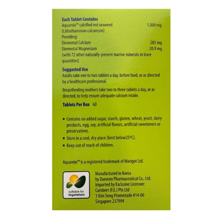 Aquamin™ calcified red seaweed (Lithothamnion calcareum) 1000 mg providing elemental calcium 285 mg, elemental magnesium 20.9 mg (with 72 other naturally present marine minerals in trace quantities)