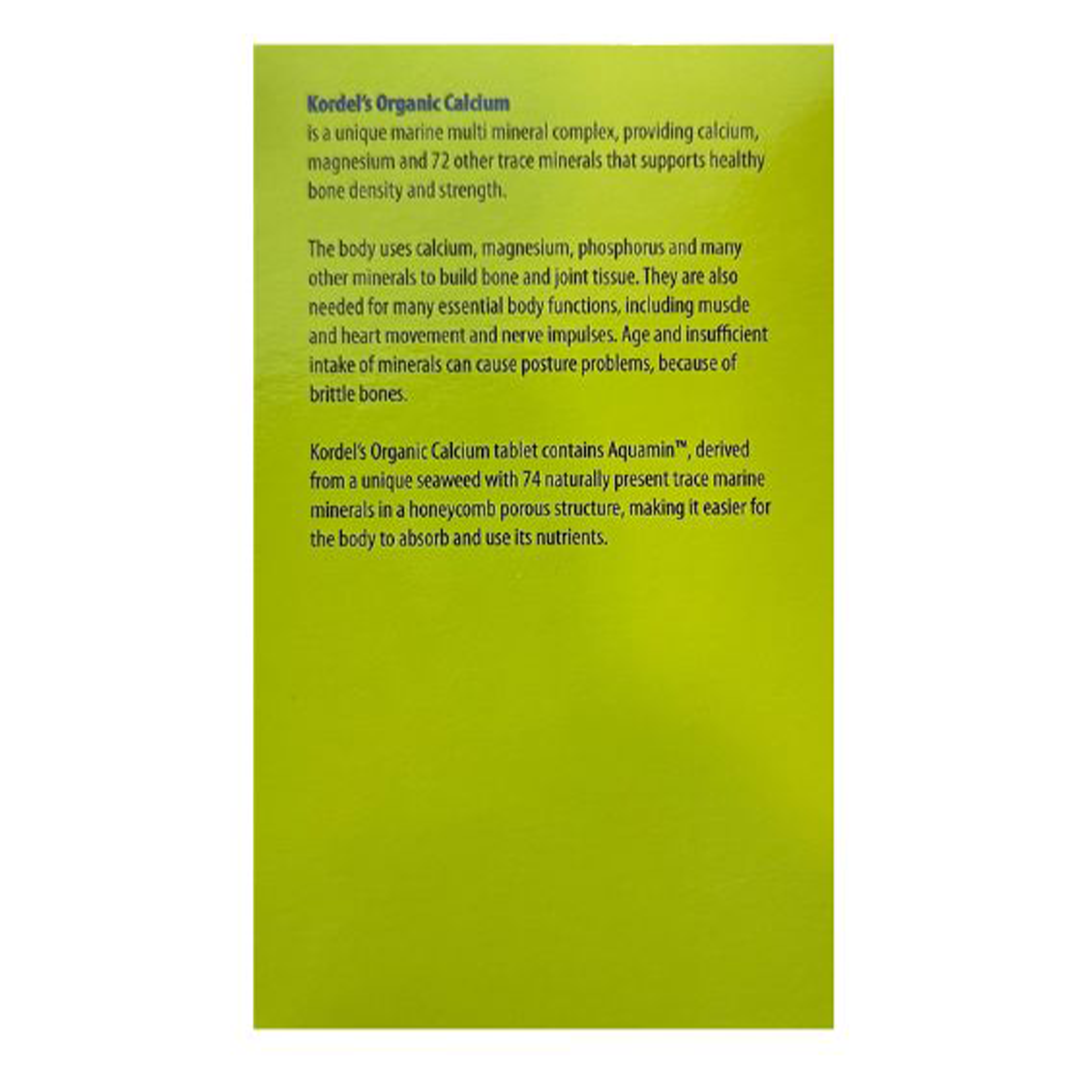 Marine-Based Multi‑Mineral Complex for Strong, Healthy Bones Kordel’s Organic Calcium is a premium bone-support supplement featuring Aquamin™—a calcified red seaweed (Lithothamnion calcareum) rich in 285 mg elemental calcium, 20.9 mg magnesium, plus 72 naturally occurring trace minerals per tablet. The honeycomb-like seaweed matrix enhances absorption and makes these nutrients easier for the body to utilise. Clinically formulated to support bone density, joint tissue health, muscle function, and nerve transmission. Free from gluten, dairy, soy, artificial colours, flavours, sweeteners, and preservatives; suitable for vegetarians.