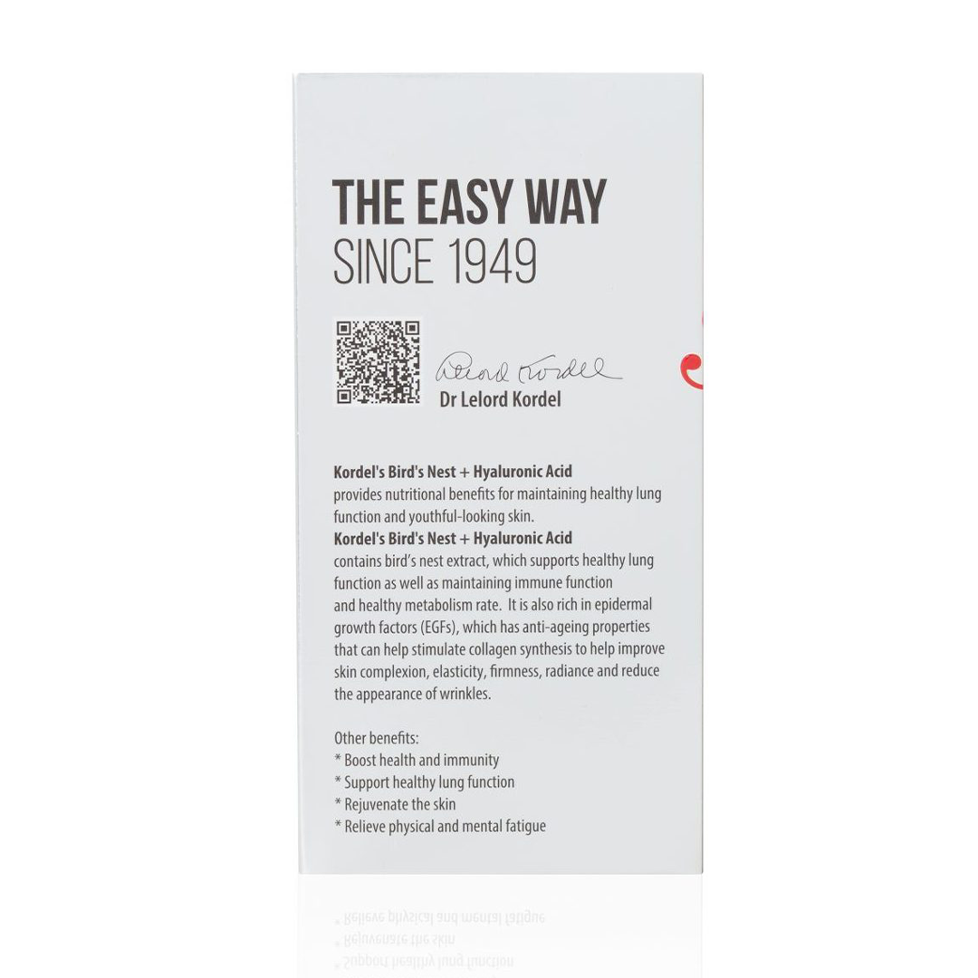 Supports skin hydration, elasticity, and youthful radiance Kordel’s Bird’s Nest + Hyaluronic Acid combines the nourishing benefits of premium Bird’s Nest extract with Hyaluronic Acid to support skin health from within. This formula helps maintain skin hydration, improve elasticity, and promote a youthful glow. Bird’s Nest is traditionally valued for its beauty-enhancing properties, while Hyaluronic Acid aids in retaining skin moisture and suppleness.