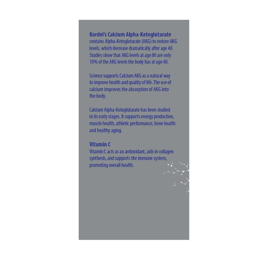 Support healthy ageing and energy with Kordel’s Calcium Alpha-Ketoglutarate (Ca-AKG). Each softgel delivers 500 mg of Ca-AKG and 250 mg of vitamin C to help restore cellular energy, maintain muscle and bone health, and promote overall vitality. Vegetarian-friendly and free from common allergens.