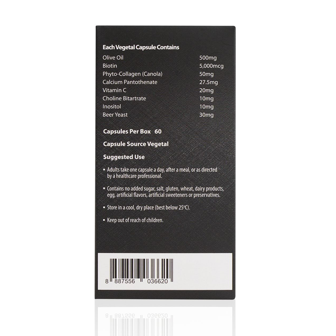 Olive Oil 500 mg, Biotin 5000 mcg, Phyto-Collagen (Canola) 50 mg, Calcium Pantothenate 27.5 mg, Vitamin C 20 mg, Beer Yeast 30 mg