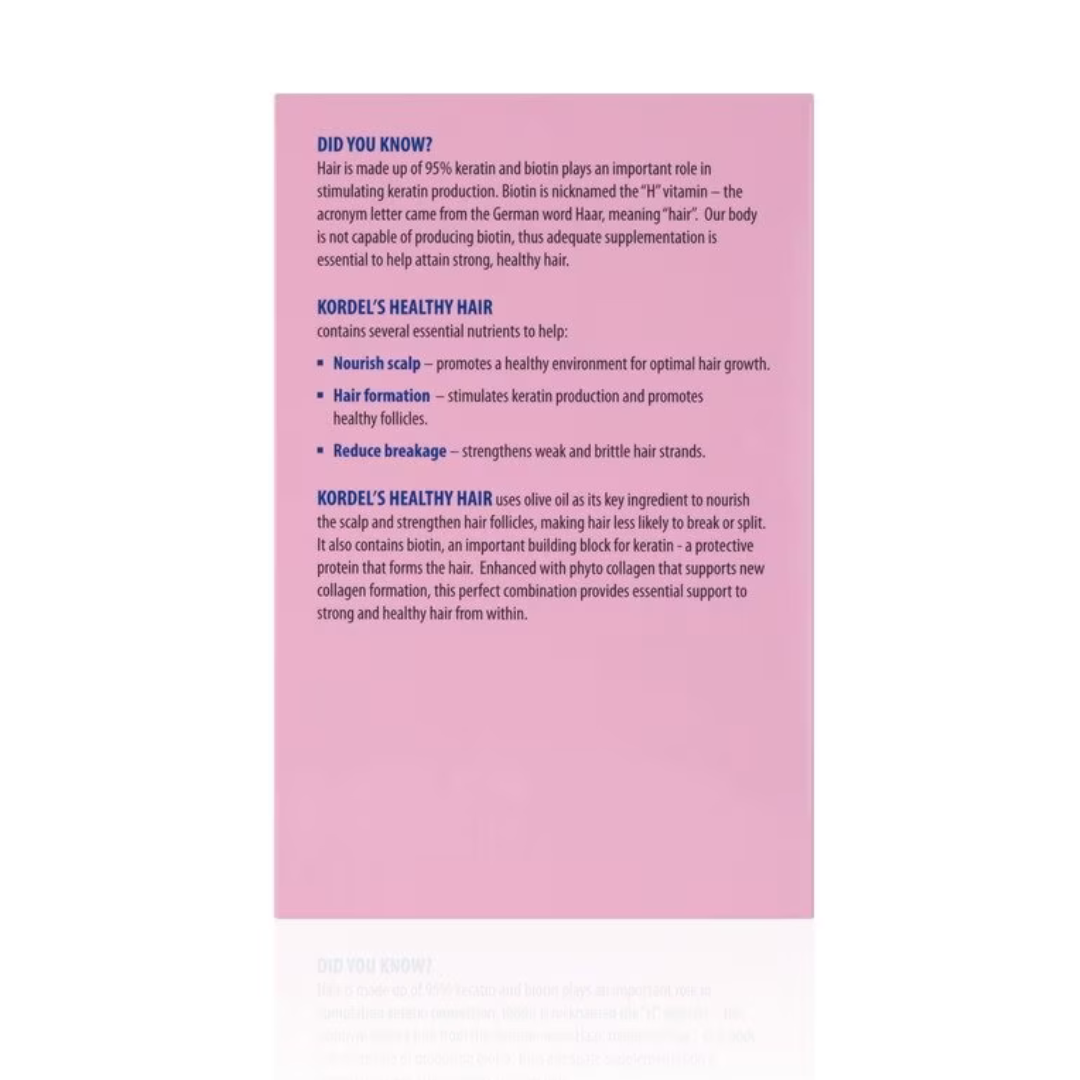 Support healthy, vibrant hair from within with Kordel’s Healthy Hair. This comprehensive formula contains essential vitamins, minerals, and herbal extracts to combat hair loss, promote healthy hair growth, and strengthen brittle or thinning hair. With key nutrients like biotin, zinc, and horsetail extract, it helps revitalise the hair follicles, improve scalp health, and maintain shiny, resilient hair.