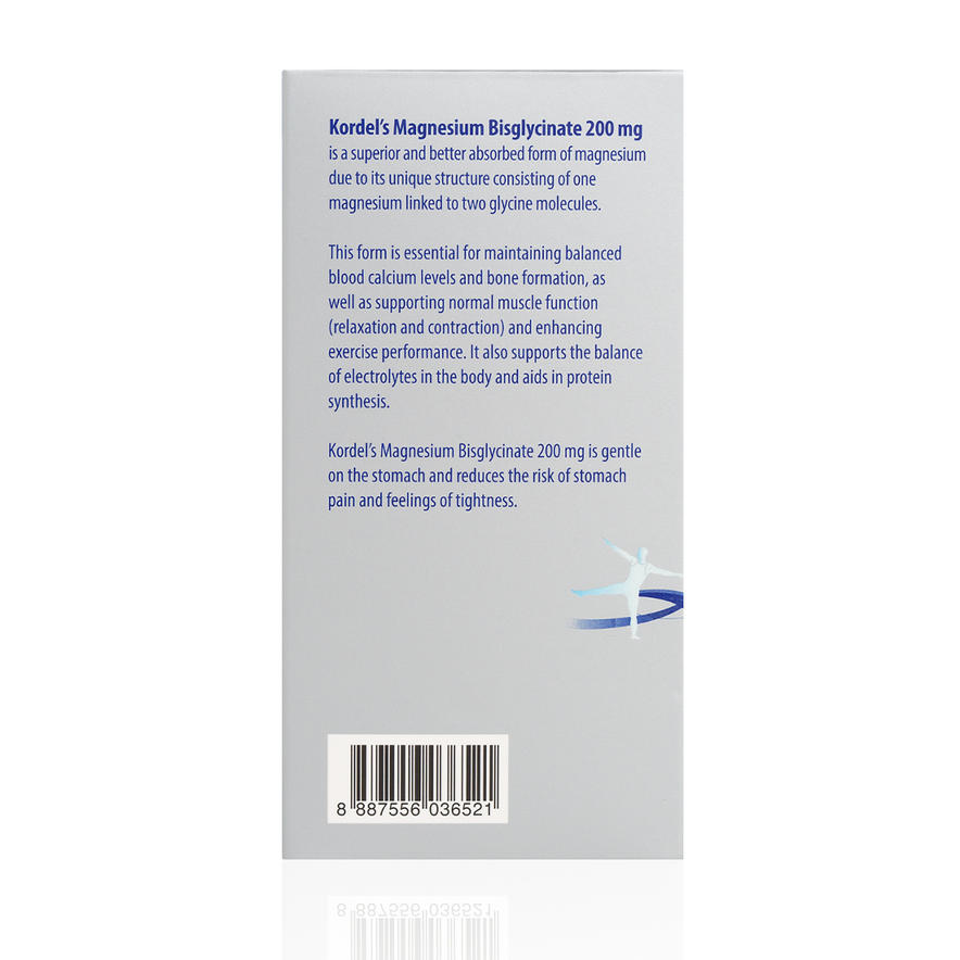 Supports muscle relaxation, energy production, and overall well-being Kordel’s Magnesium Bisglycinate 200mg provides a highly bioavailable form of magnesium that is gentle on the stomach and easily absorbed by the body. Magnesium is an essential mineral that supports muscle function, energy production, nerve health, and bone strength. This supplement is ideal for individuals experiencing muscle cramps, fatigue, or those looking to maintain overall wellness.