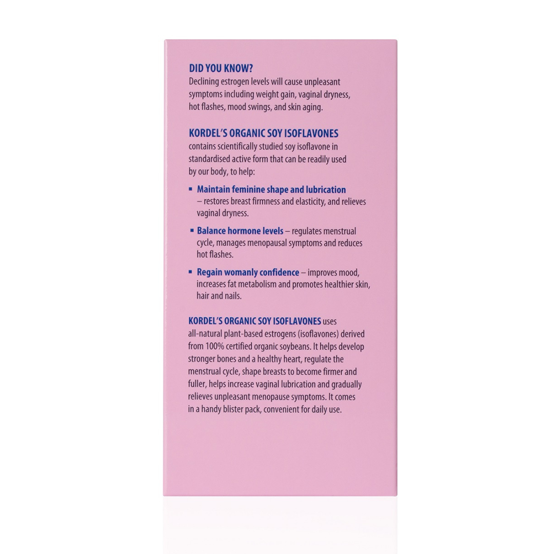 Achieve natural wellness the soy way with Kordel’s Organic Soy Isoflavones, crafted from 100% certified organic soybeans in a double-standardised extract for optimal potency. Each tablet delivers 100 mg of soy extract standardized to 40% isoflavones, including genistein and daidzein, to support women through menstrual cycles, menopause, and beyond. Conveniently packed in a blister pack, these vegetarian-friendly tablets are designed for everyday ease.