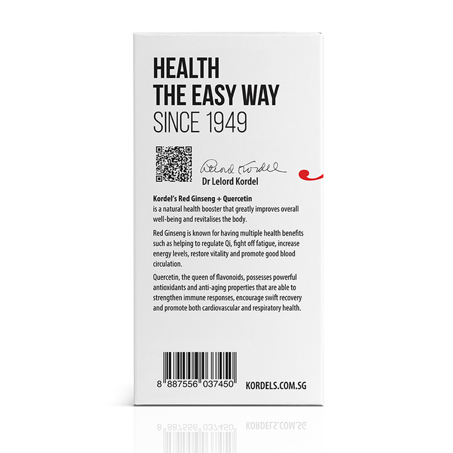Kordel’s Red Ginseng + Quercetin combines the power of Korean Red Ginseng and Quercetin to support vitality, immune function, and overall well-being. This vegetarian-friendly supplement is designed to help you feel revitalized and energized.
