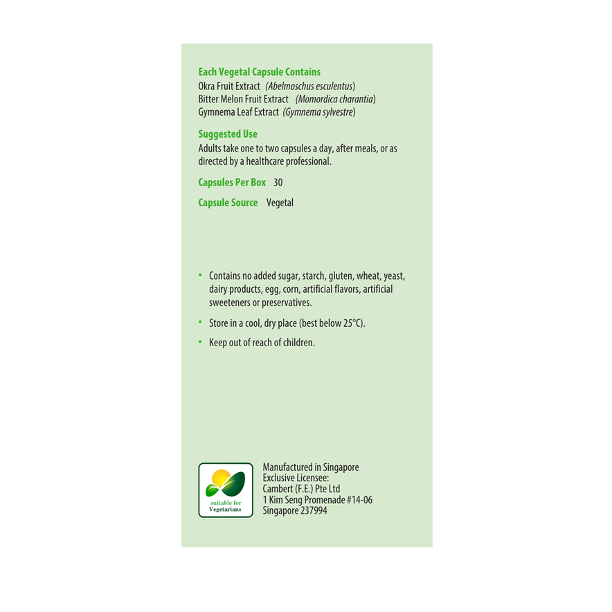 Okra fruit extract (Abelmoschus esculentus) 100 mg, bitter melon fruit extract (Momordica charantia) 100 mg, gymnema leaf extract (Gymnema sylvestre) 50 mg
