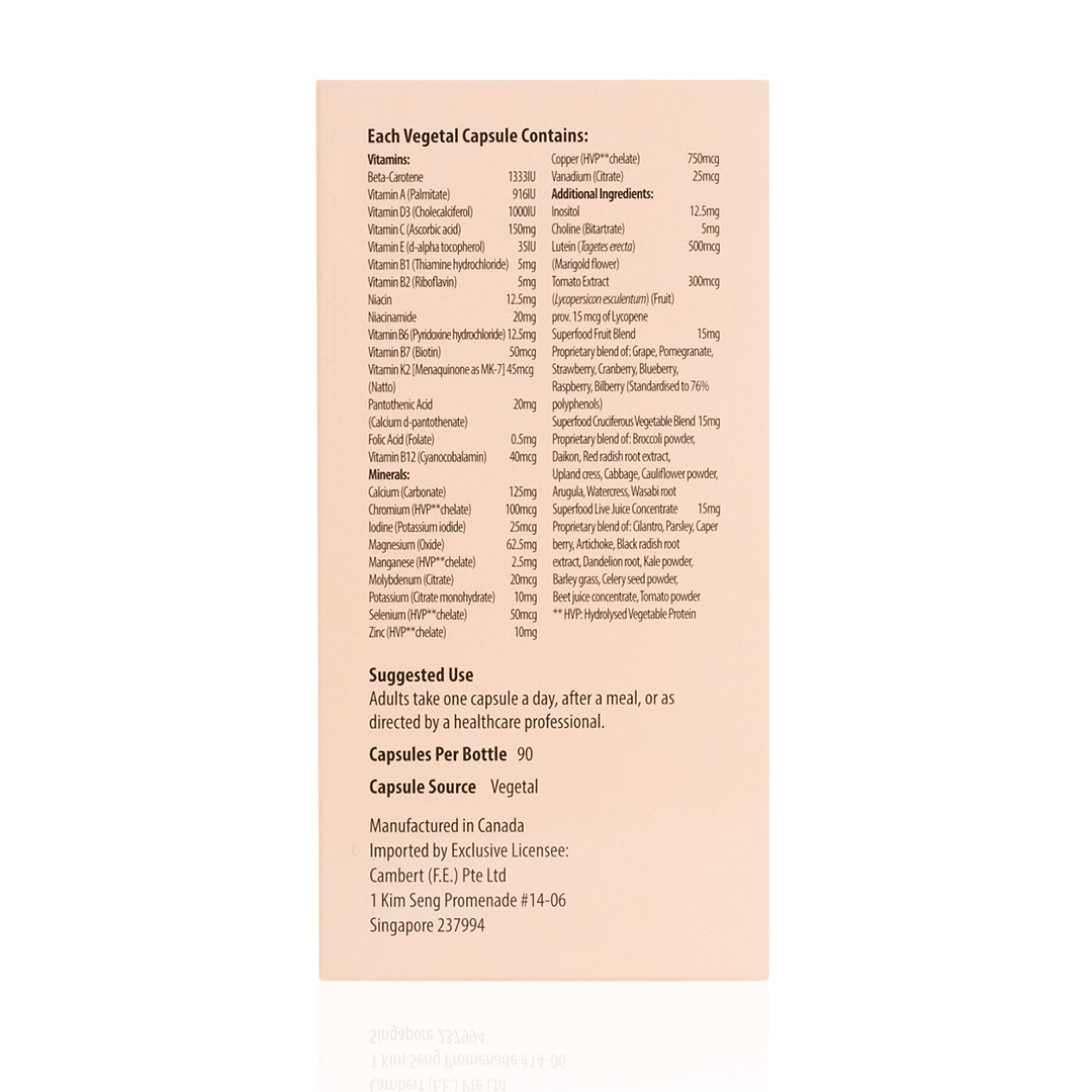 Beta-Carotene 1333 IU, Vitamin A (Palmitate) 916 IU, Vitamin D3 (Cholecalciferol) 1000 IU, Vitamin C (Ascorbic acid) 150 mg, Vitamin E (d-alpha tocopherol) 35 IU, Vitamin B1 (Thiamine hydrochloride) 5 mg, Vitamin B2 (Riboflavin) 5 mg, Niacin 12.5 mg, Niacinamide 20 mg, Vitamin B6 (Pyridoxine hydrochloride) 12.5 mg, Vitamin B7 (Biotin) 50 mcg, Vitamin K2 [Menaquinone as MK-7] (Natto) 45 mcg, Pantothenic Acid (Calcium d-pantothenate) 20 mg, Folic Acid (Folate) 0.5 mg, Vitamin B12 (Cyanocobalamin) 40 mcg, Calcium (Carbonate) 125 mg, Chromium (HVP chelate) 100 mcg, Iodine (Potassium iodide) 25 mcg, Magnesium (Oxide) 62.5 mg, Manganese (HVP chelate) 2.5 mg, Molybdenum (Citrate) 20 mcg, Potassium (Citrate monohydrate) 10 mg, Selenium (HVP chelate) 50 mcg, Zinc (HVP chelate) 10 mg, Copper (HVP chelate) 750 mcg, Vanadium (Citrate) 25 mcg, Inositol 12.5 mg, Choline (Bitartrate) 5 mg, Lutein (Tagetes erecta, marigold flower) 500 mcg, Tomato Extract (Lycopersicon esculentum, fruit, providing 15 mcg Lycopene) 300 mcg, Superfood Fruit Blend 15 mg (Grape, Pomegranate, Strawberry, Cranberry, Blueberry, Raspberry, Bilberry – standardised to 76% polyphenols), Superfood Cruciferous Vegetable Blend 15 mg (Broccoli powder, Daikon, Red radish root extract, Upland cress, Cabbage, Cauliflower powder, Arugula, Watercress, Wasabi root), Superfood Live Juice Concentrate 15 mg (Cilantro, Parsley, Caperberry, Artichoke, Black radish root extract, Dandelion root, Kale powder, Barley grass, Celery seed powder, Beet juice concentrate, Tomato powder)