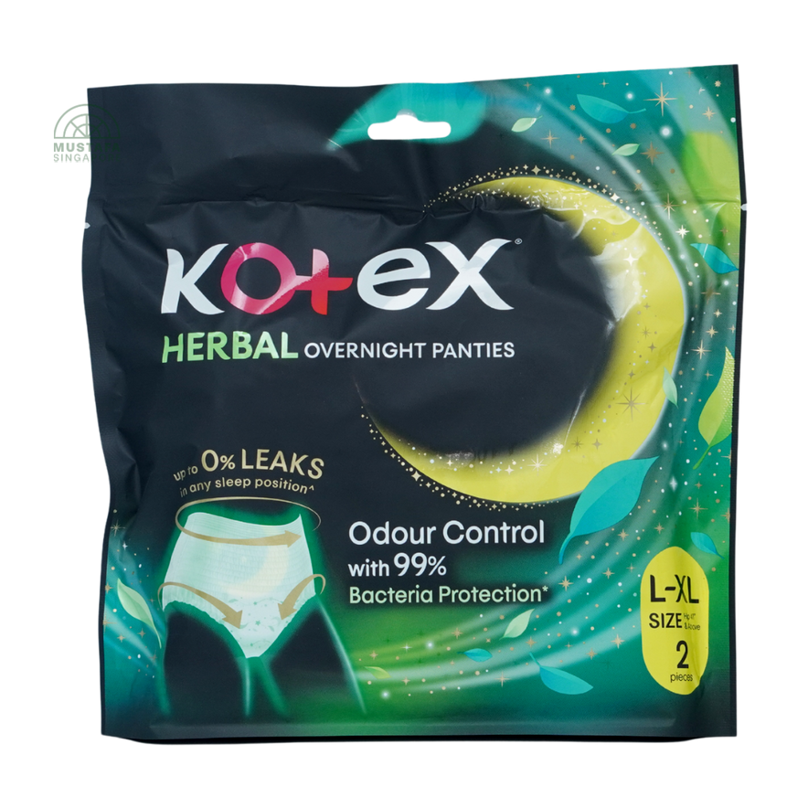 Kotex Herbal Overnight Pants L/XL are made for larger body sizes, offering maximum coverage with herbal freshness. These pant-style sanitary pants provide 360° overnight leak protection, breathable comfort, and added herbal care for worry-free sleep.