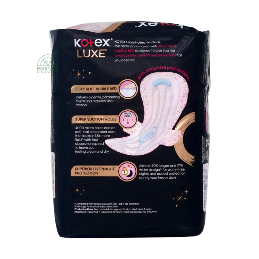 Kotex Luxe Ultrathin Overnight Wing 32cm 12s offers slim yet powerful overnight protection. With a longer 32cm length and ultrathin comfort, these pads are perfect for medium to heavy overnight flow while staying soft and discreet.