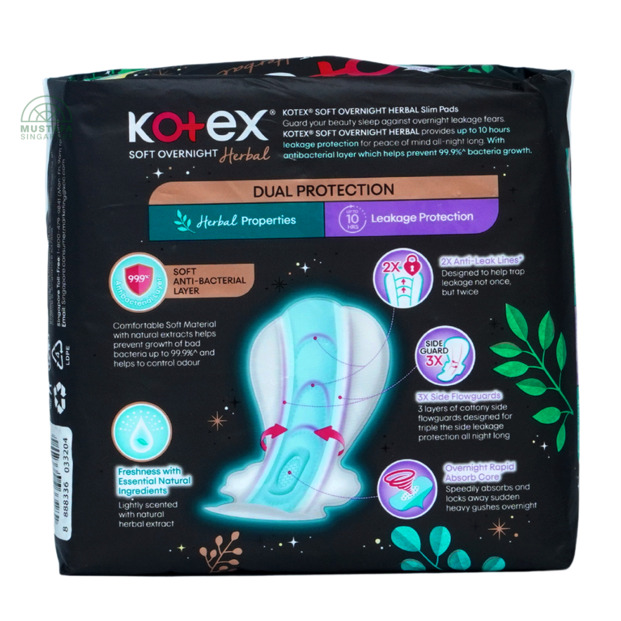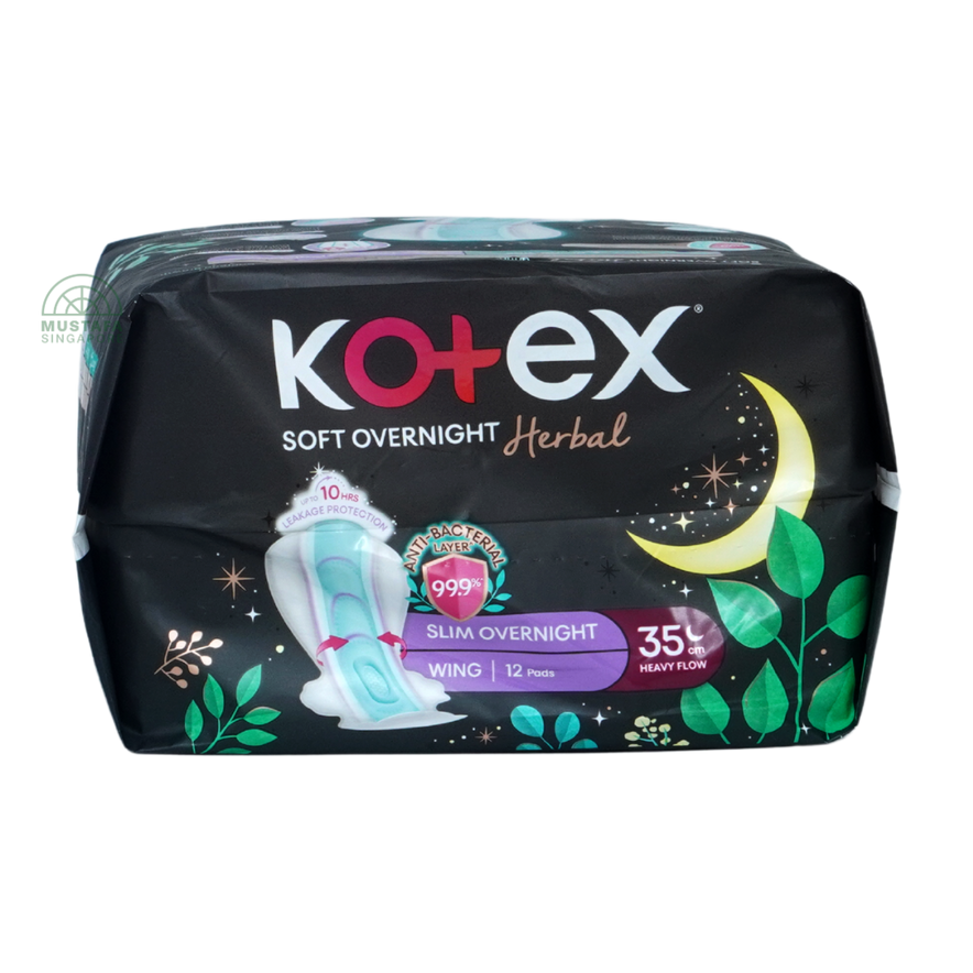 Kotex Soft & Smooth Herbal Slim Overnight 35cm 12s combines overnight security with herbal freshness. With a 35cm length and secure wings, these pads provide superior coverage for heavy flow nights while the natural herbal essence helps keep you feeling fresh and comfortable.