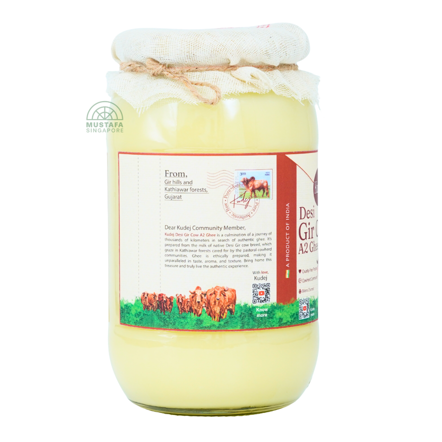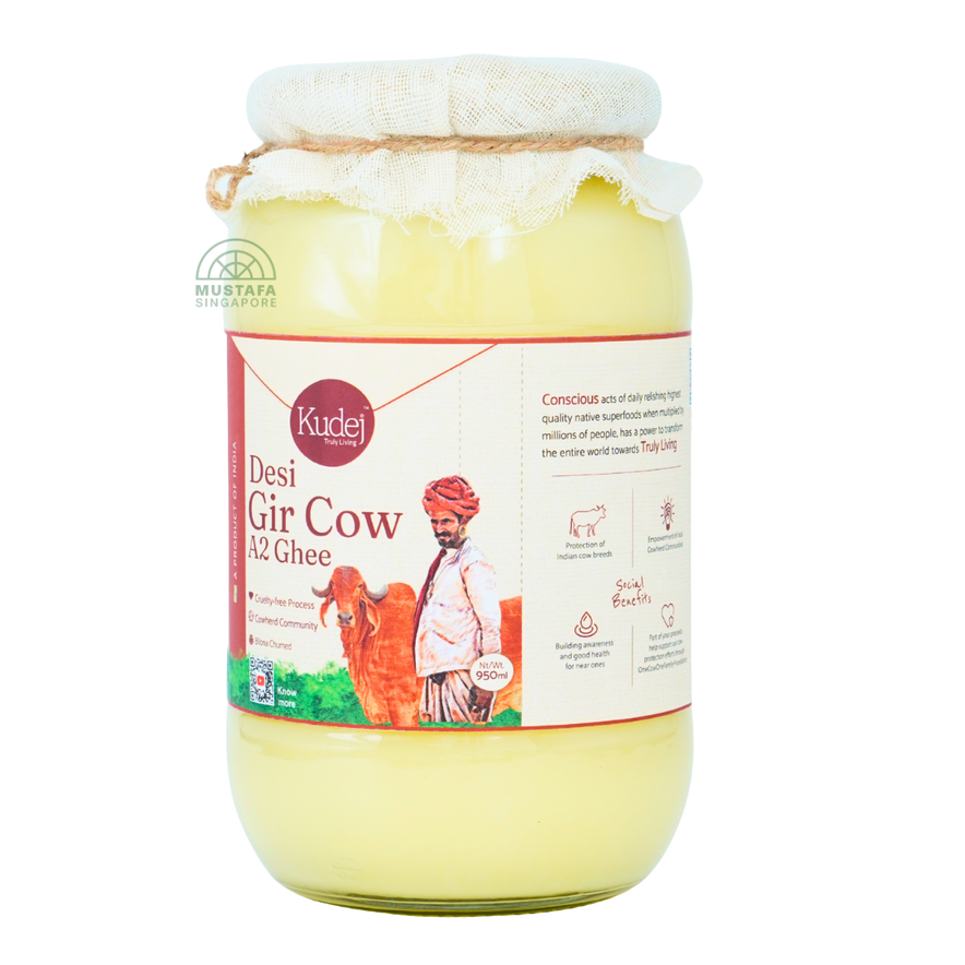 Kudej Desi Gir Cow A2 Ghee 950ml is made from the milk of Gir cows with A2 proteins, providing a healthy, aromatic ghee for cooking, baking, and traditional Indian recipes.