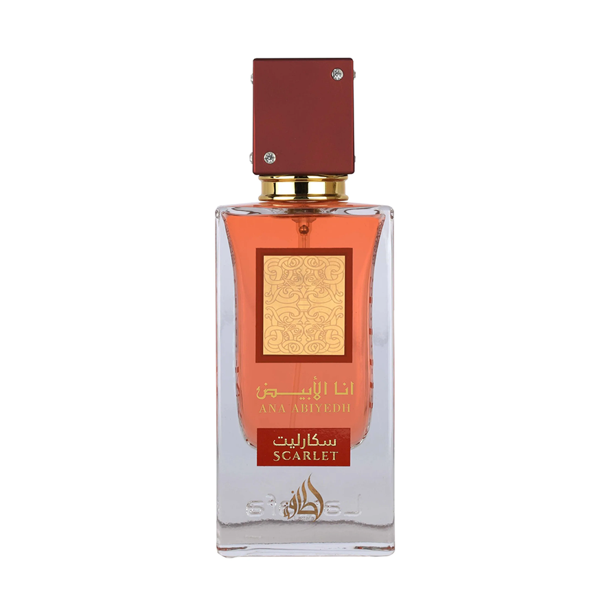 Lattafa Ana Abiyedh Scarlet Eau de Parfum 100ml is a sweet and vibrant oriental-gourmand fragrance. It opens with fruity sweetness, blooms into a warm heart, and settles on a creamy base.