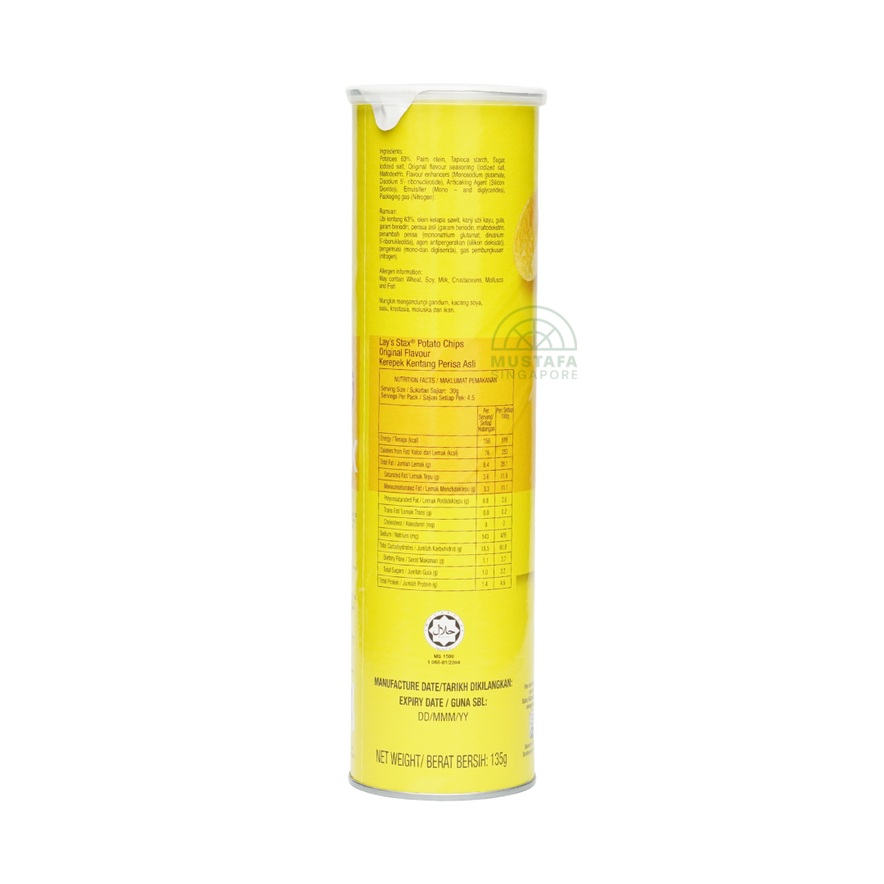 Lay's Stax - Original delivers the classic, timeless potato crisp flavor in a convenient stackable canister format. Made from thick-cut, crunchy potato crisps seasoned lightly with just the right amount of salt, these chips offer a clean, satisfying salty bite that's perfect for snacking, sharing, or pairing with dips.