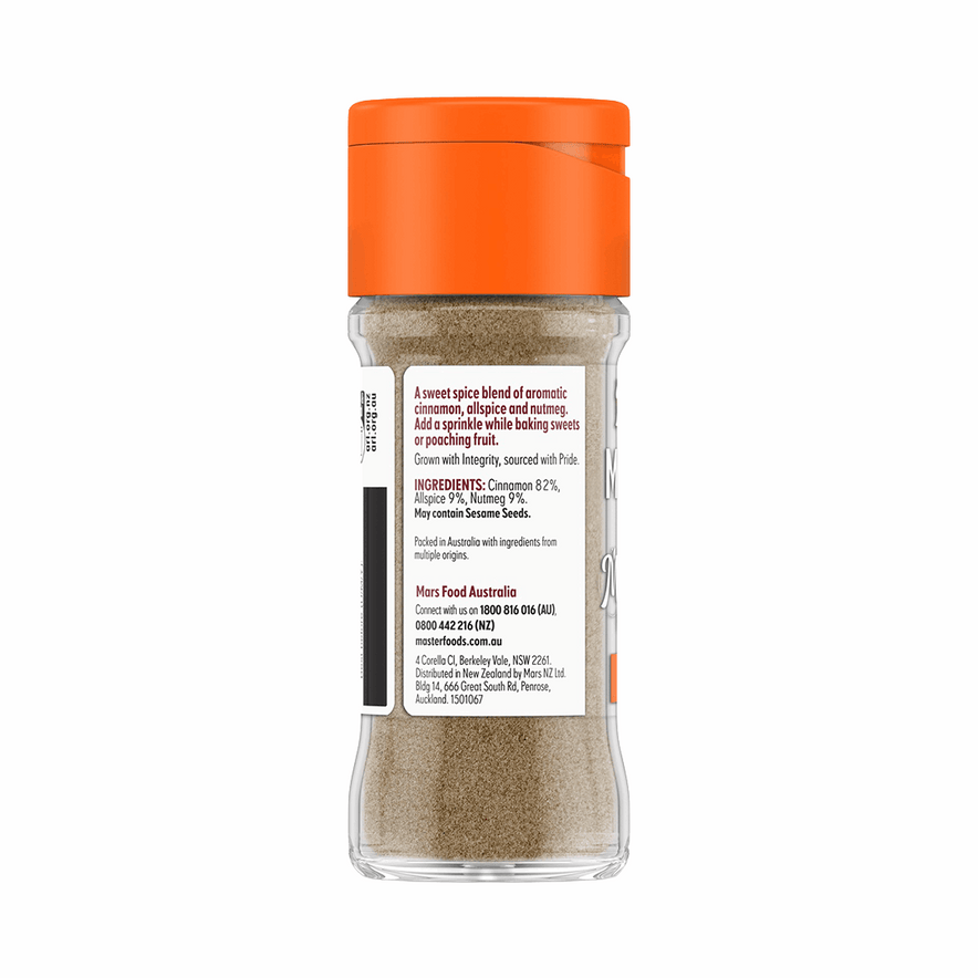 MasterFoods Mixed Spice offers a warm and aromatic blend of cinnamon, nutmeg, and cloves, ideal for baking cakes, cookies, and festive desserts.