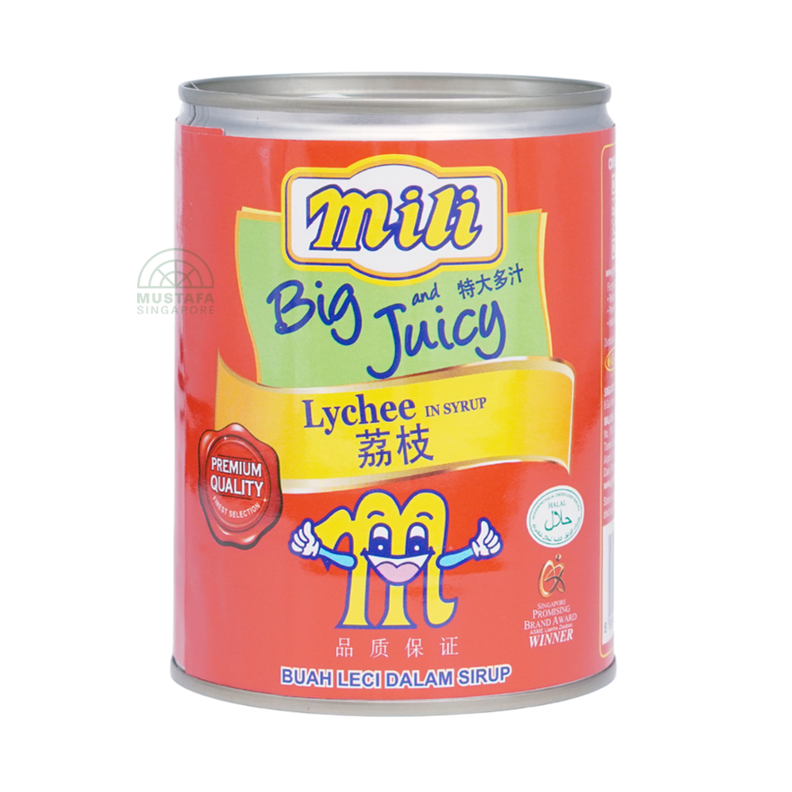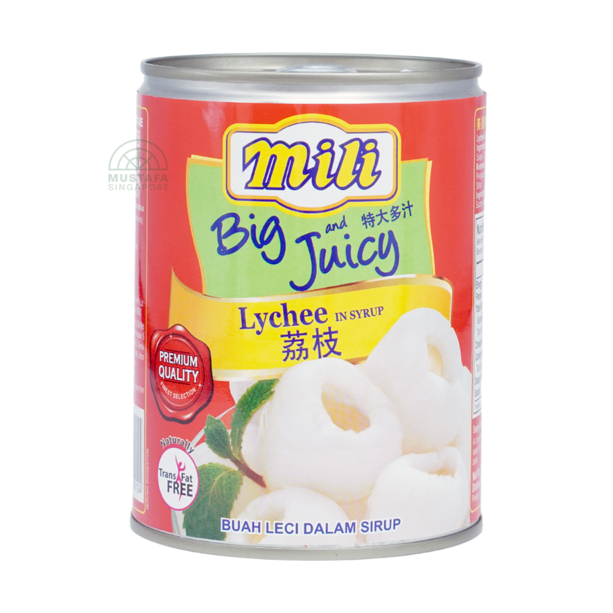 Mili Big and Juicy Lychee in Syrup 565g contains premium lychees in syrup, delivering naturally sweet, juicy fruit for desserts and refreshing treats.