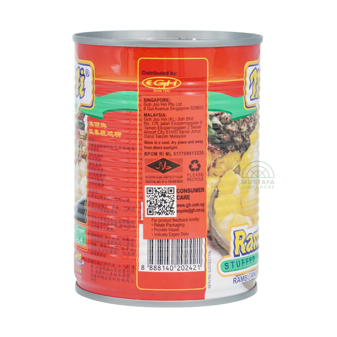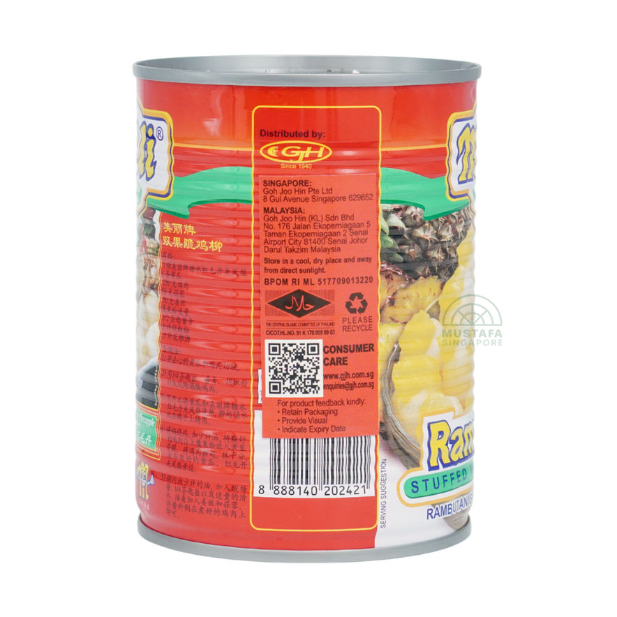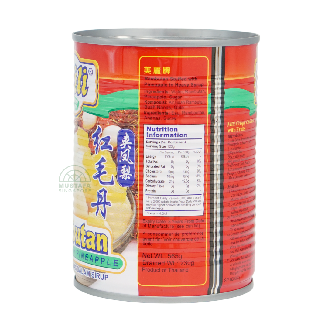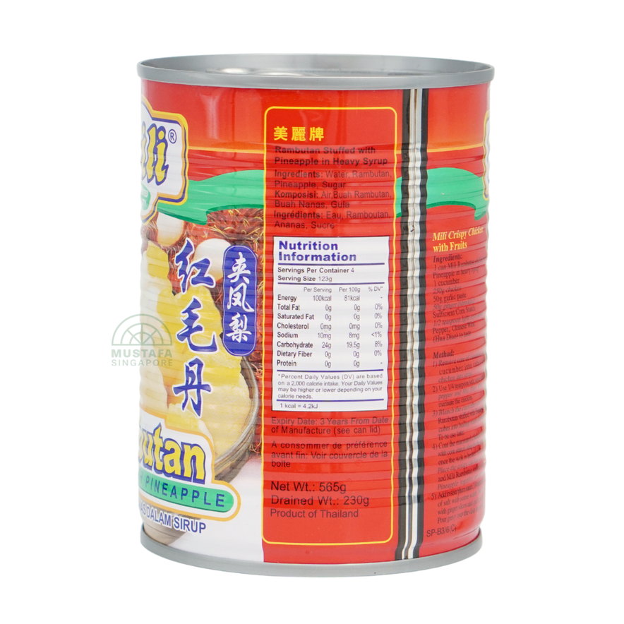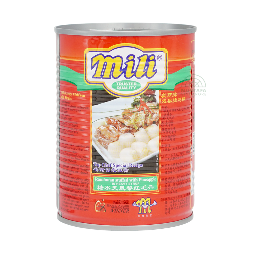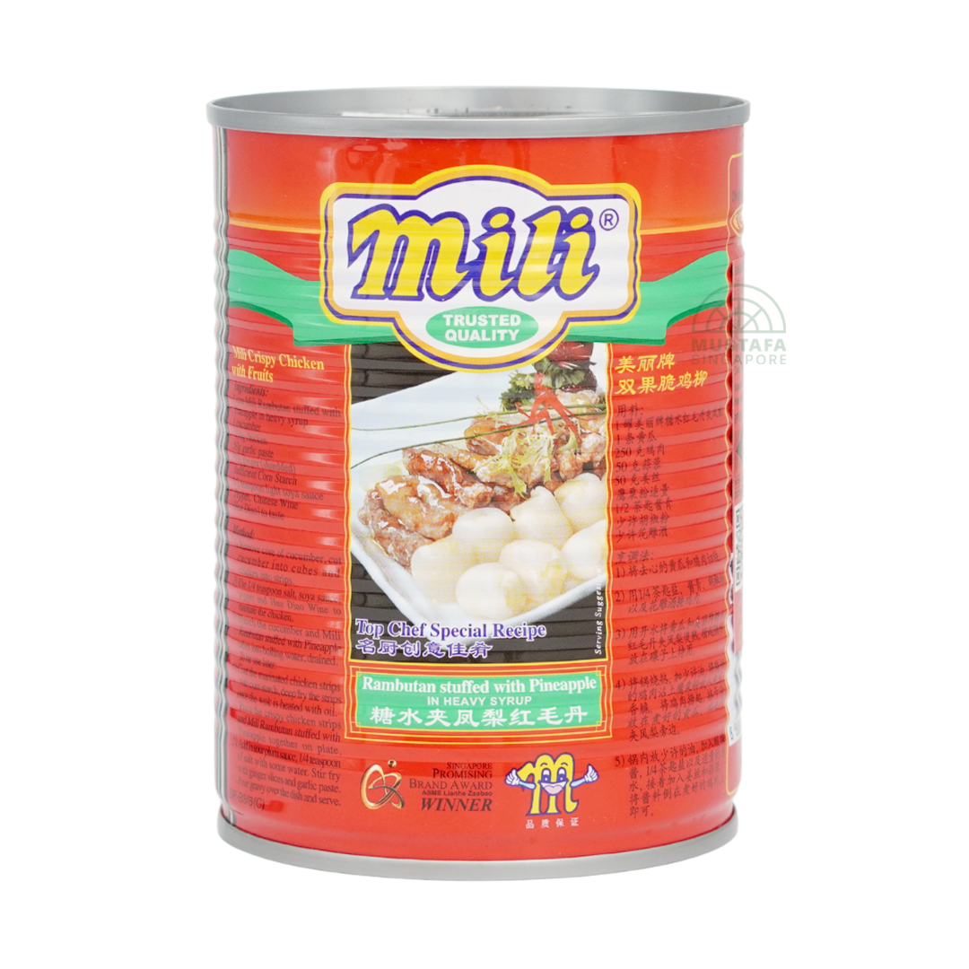 Mili Rambutan Stuffed with Pineapple 565g combines succulent rambutan with sweet pineapple filling in syrup, ideal for tropical desserts and refreshing treats.