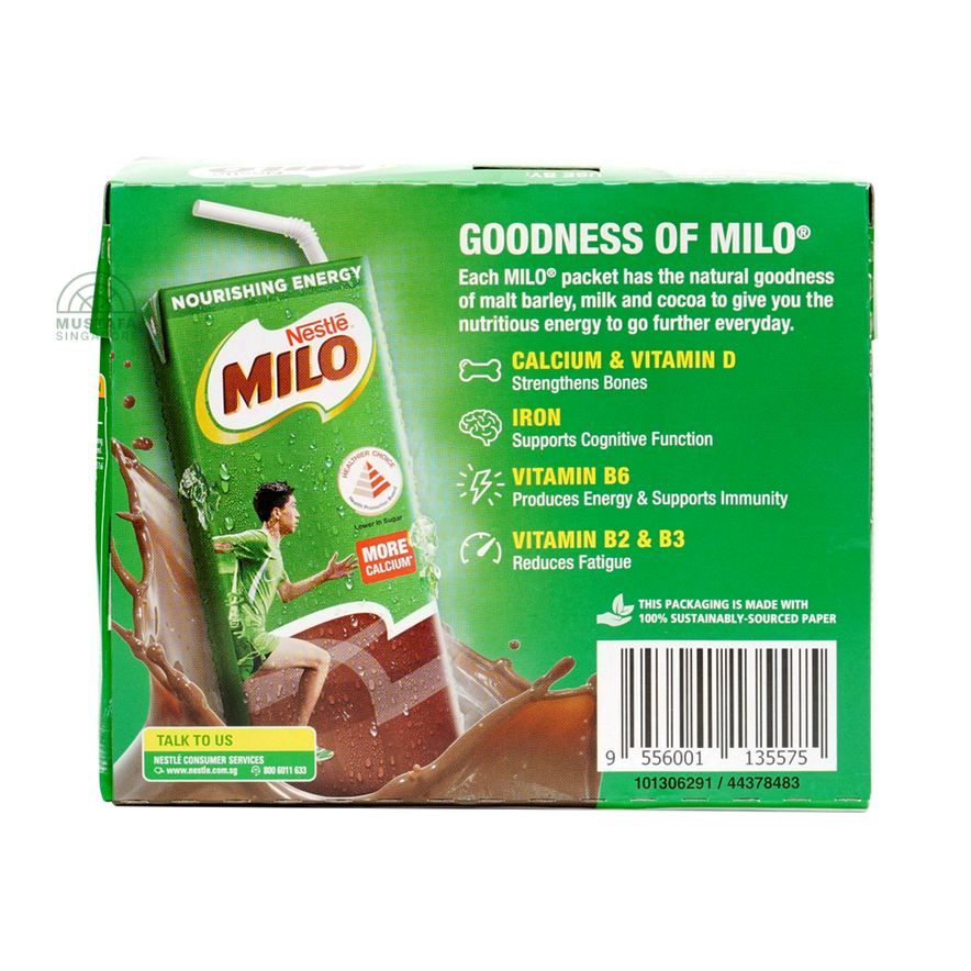 Enjoy the classic chocolate-malt goodness of Nestlé Milo Original in a convenient ready-to-drink pack. Packed with essential vitamins and minerals, Milo provides energy and nourishment for children and adults alike. Perfect for breakfast, snacks, or after sports.