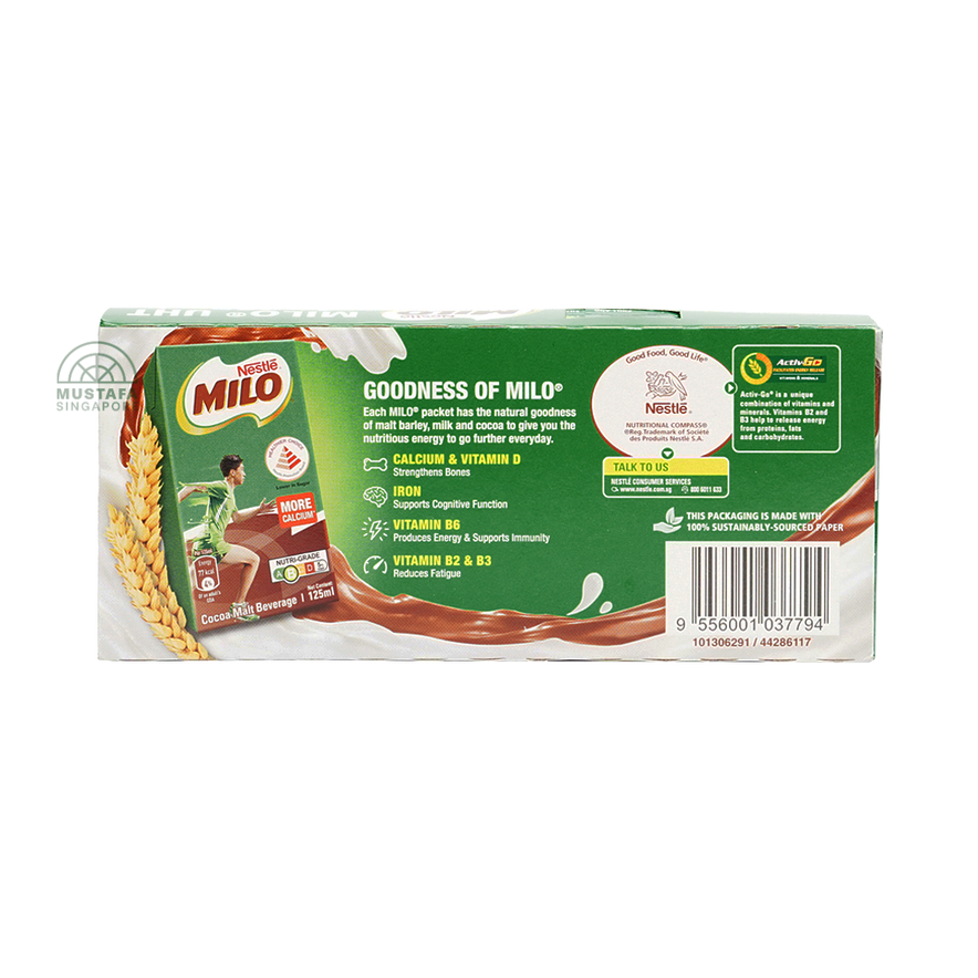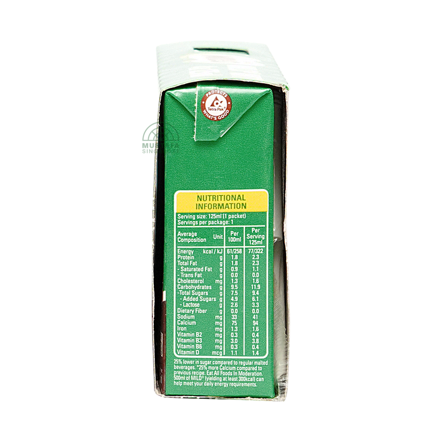 Perfect for kids and school lunches, Nestlé Milo UHT 125ml packs deliver the same nutritious Milo energy in a fun, mini size. These ready-to-drink cartons are enriched with Protomalt, milk, and cocoa for everyday nourishment.