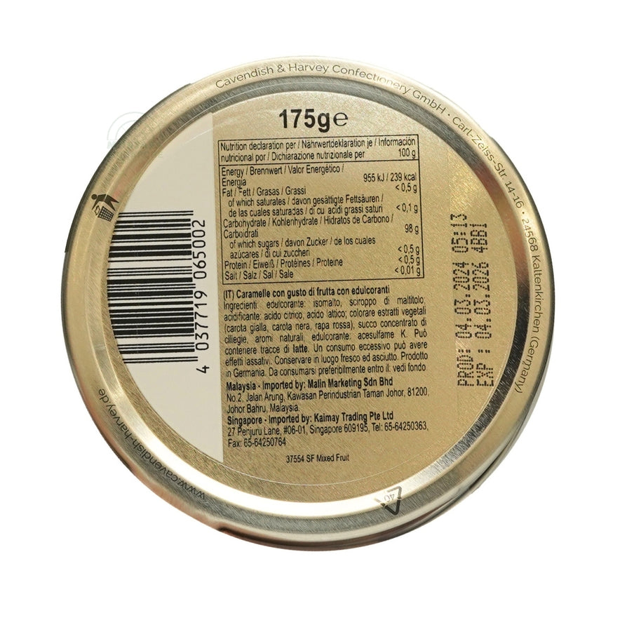 Enjoy the timeless taste of Cavendish & Harvey Mixed Fruit Drops, a premium assortment of fruit-flavoured hard candies made with real fruit juice. This best-selling selection features vibrant flavours including lemon, cherry, blackberry, orange, and pear. Each drop is delicately dusted with icing sugar and sealed in an elegant gold tin to preserve freshness and flavour. Perfect for gifting or everyday indulgence.