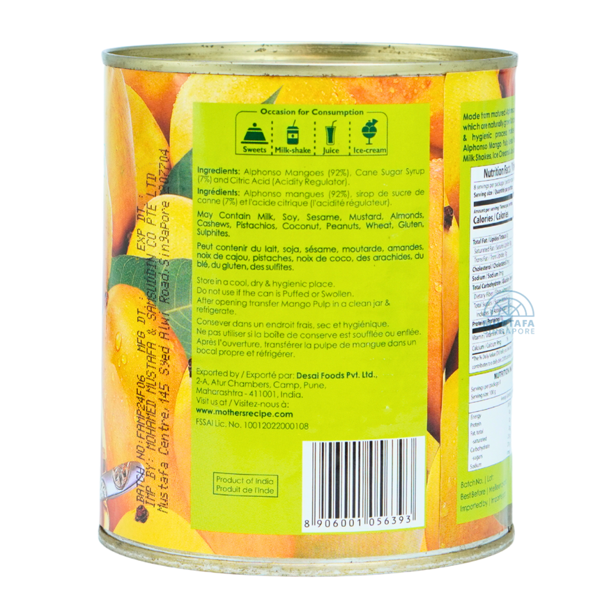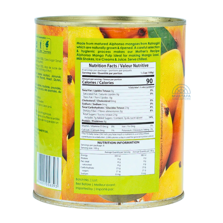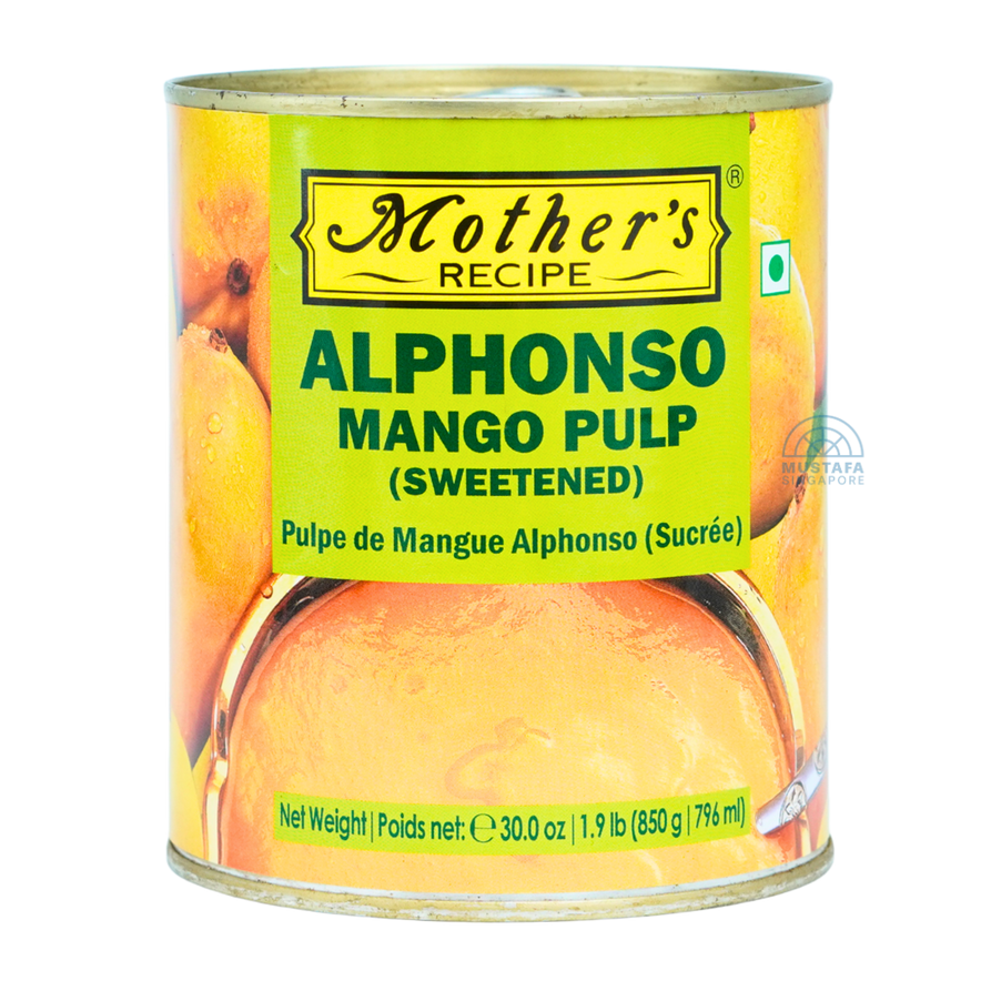 Mother's Recipe Alphonso Mango Pulp (Sweetened) 850g is made from premium Alphonso mangoes, delivering naturally sweet and smooth pulp, perfect for smoothies, desserts, shakes, and baking
