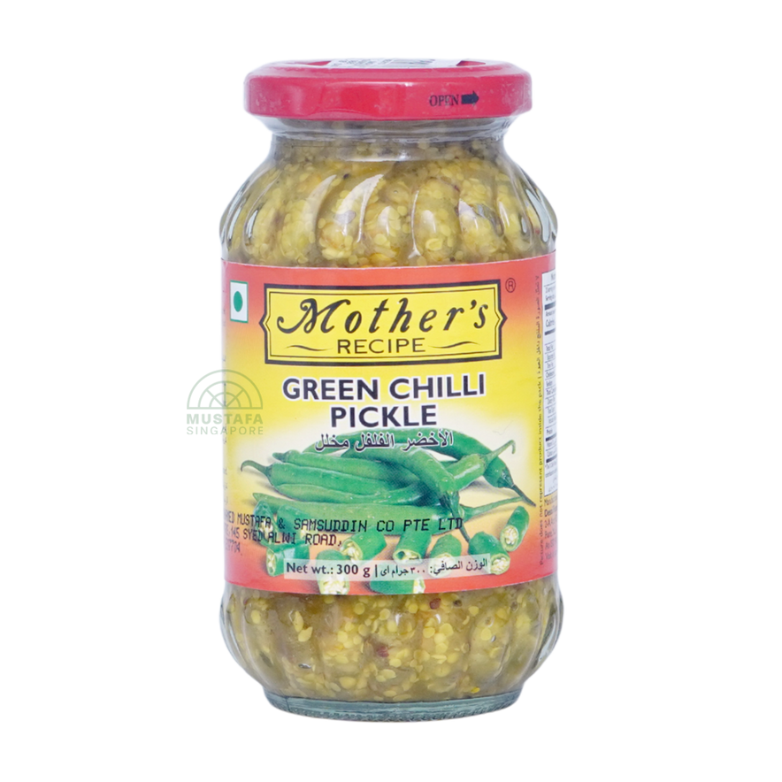 Mother's Recipe Green Chilli Pickle 300g combines fresh green chilies with mustard oil and spices, delivering a spicy punch for curries, rice, and snacks.