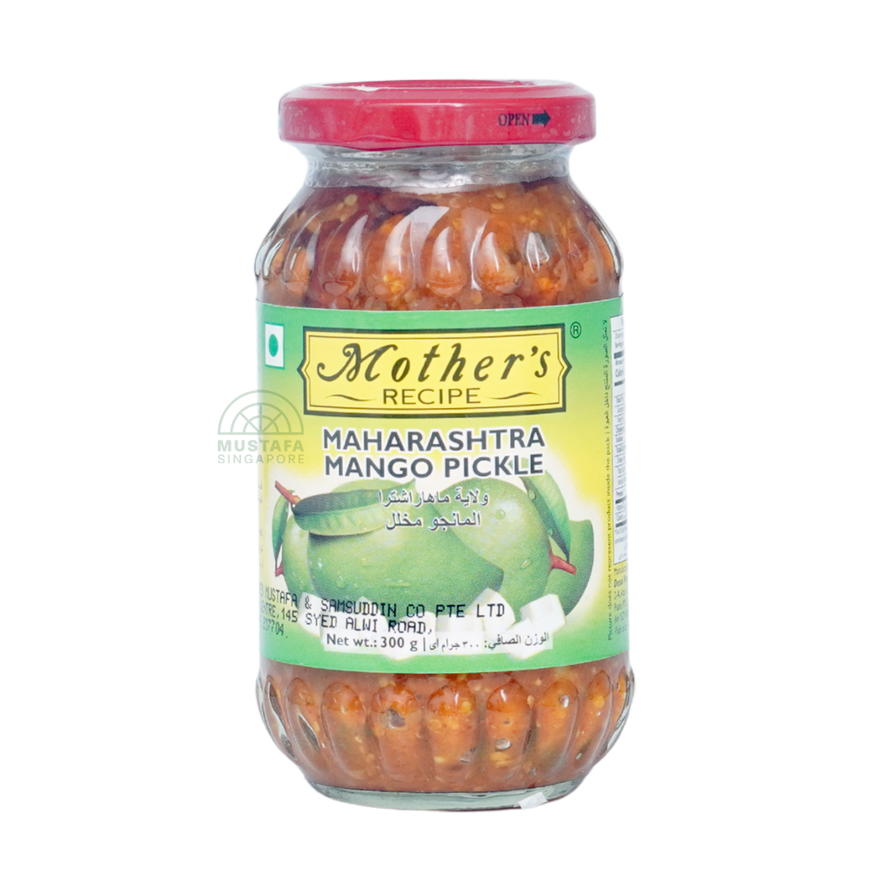 Mother's Recipe Maharashtra Mango Pickle 300g is crafted from tender raw mangoes blended with authentic Indian spices, offering a tangy, spicy flavor perfect for enhancing meals.