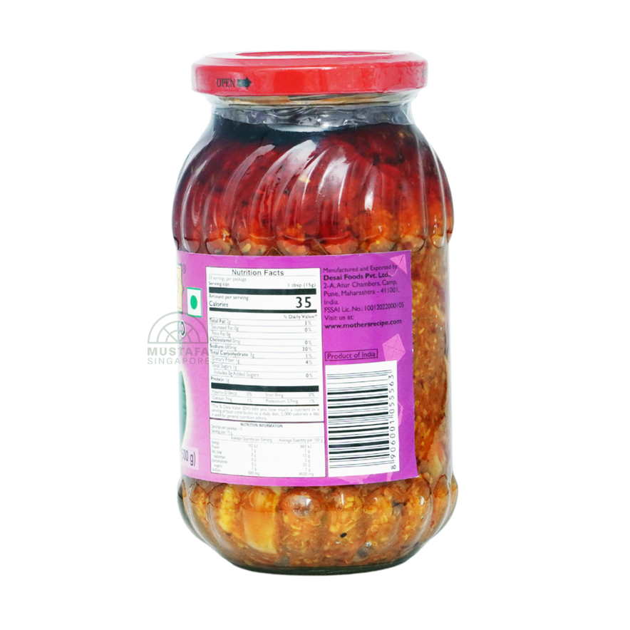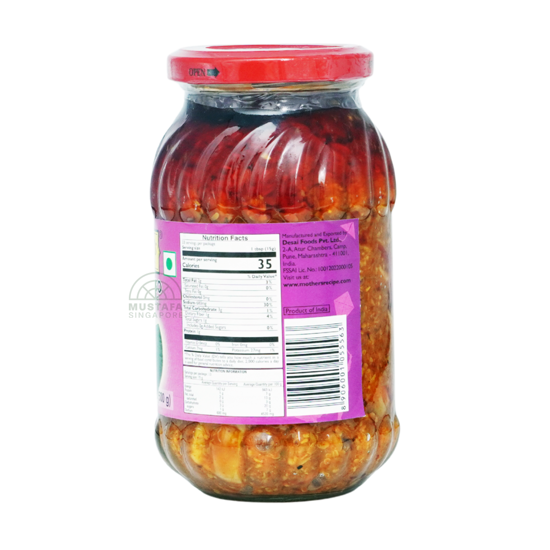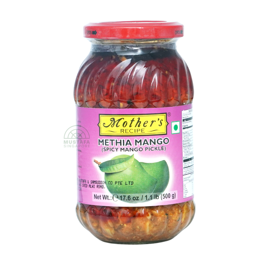Mother's Recipe Methia Mango Pickle 500g combines raw mangoes with fenugreek and bold spices for a uniquely aromatic and spicy flavor.