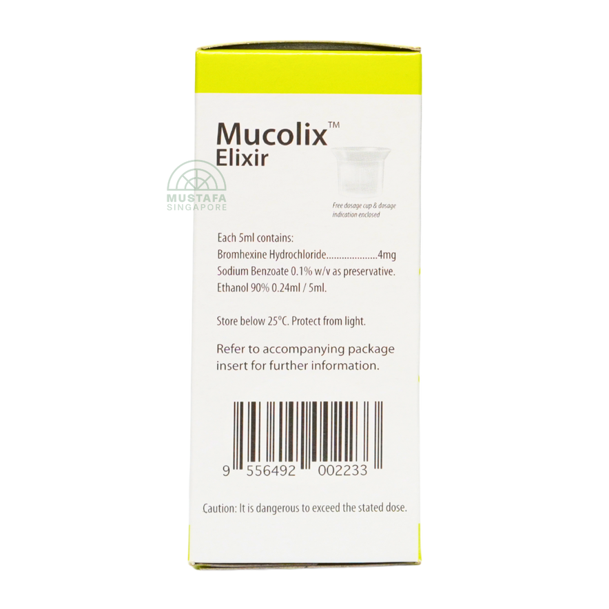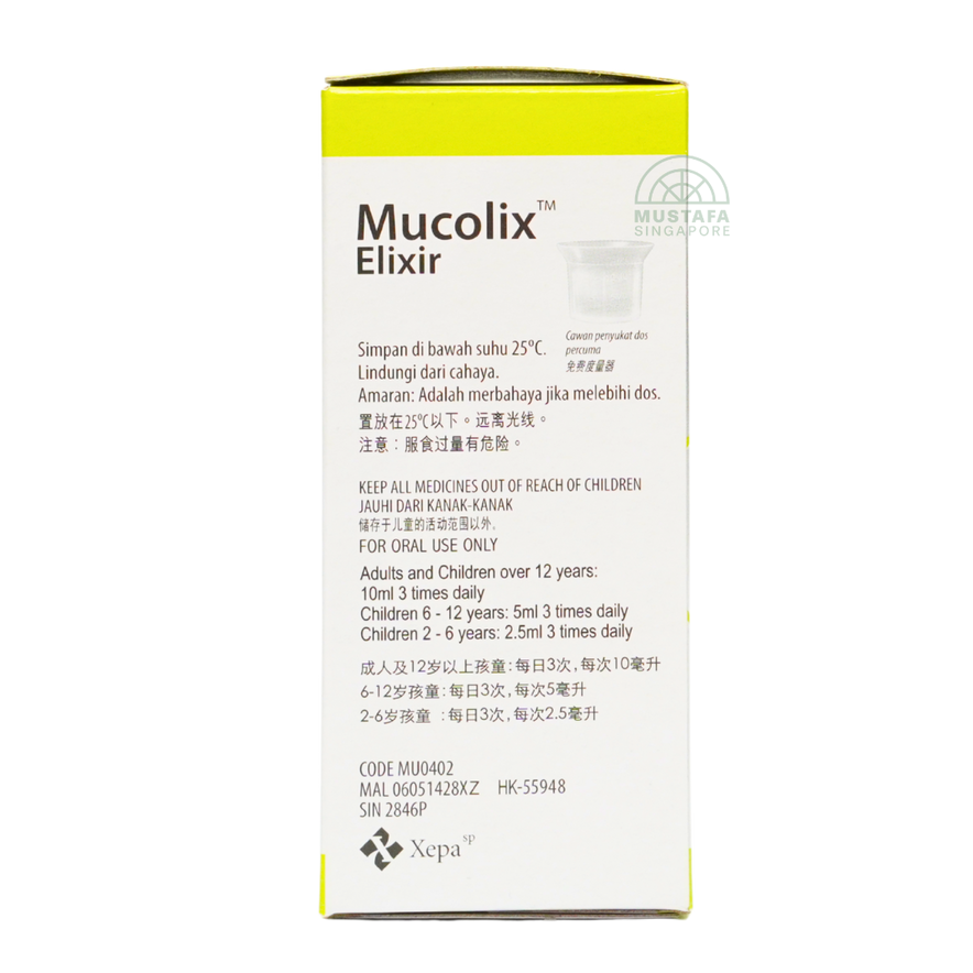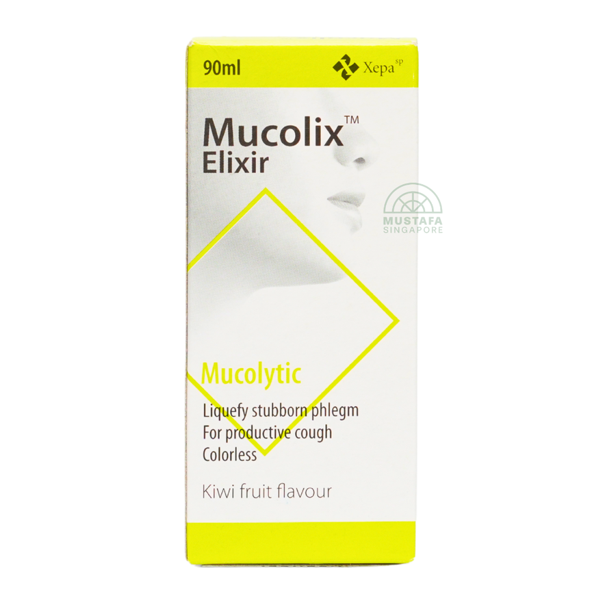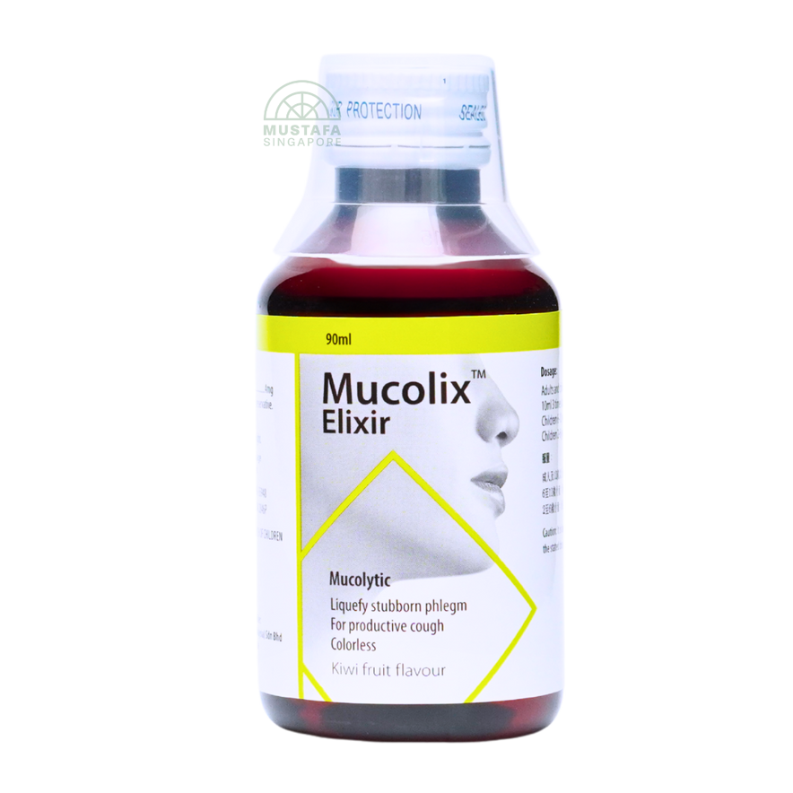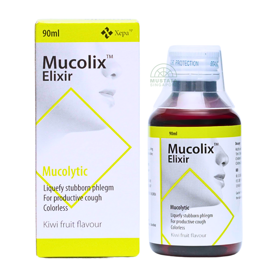 Mucolix Elixir is a colorless, kiwi-flavored mucolytic syrup formulated to liquefy stubborn phlegm and relieve productive coughs. It’s ideal for situations where thick mucus is clogging the airways, offering fast and effective relief.