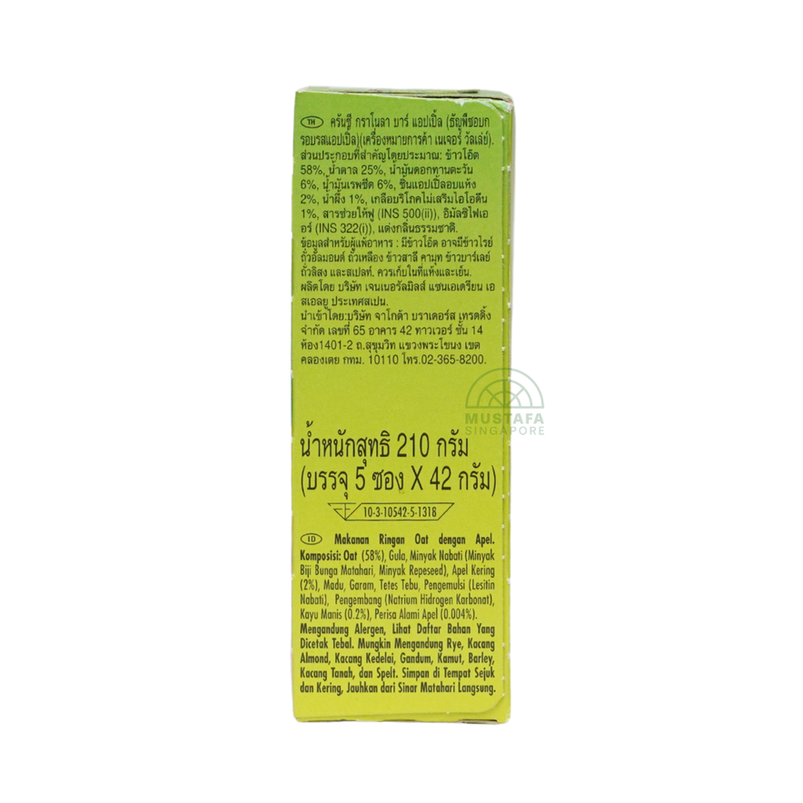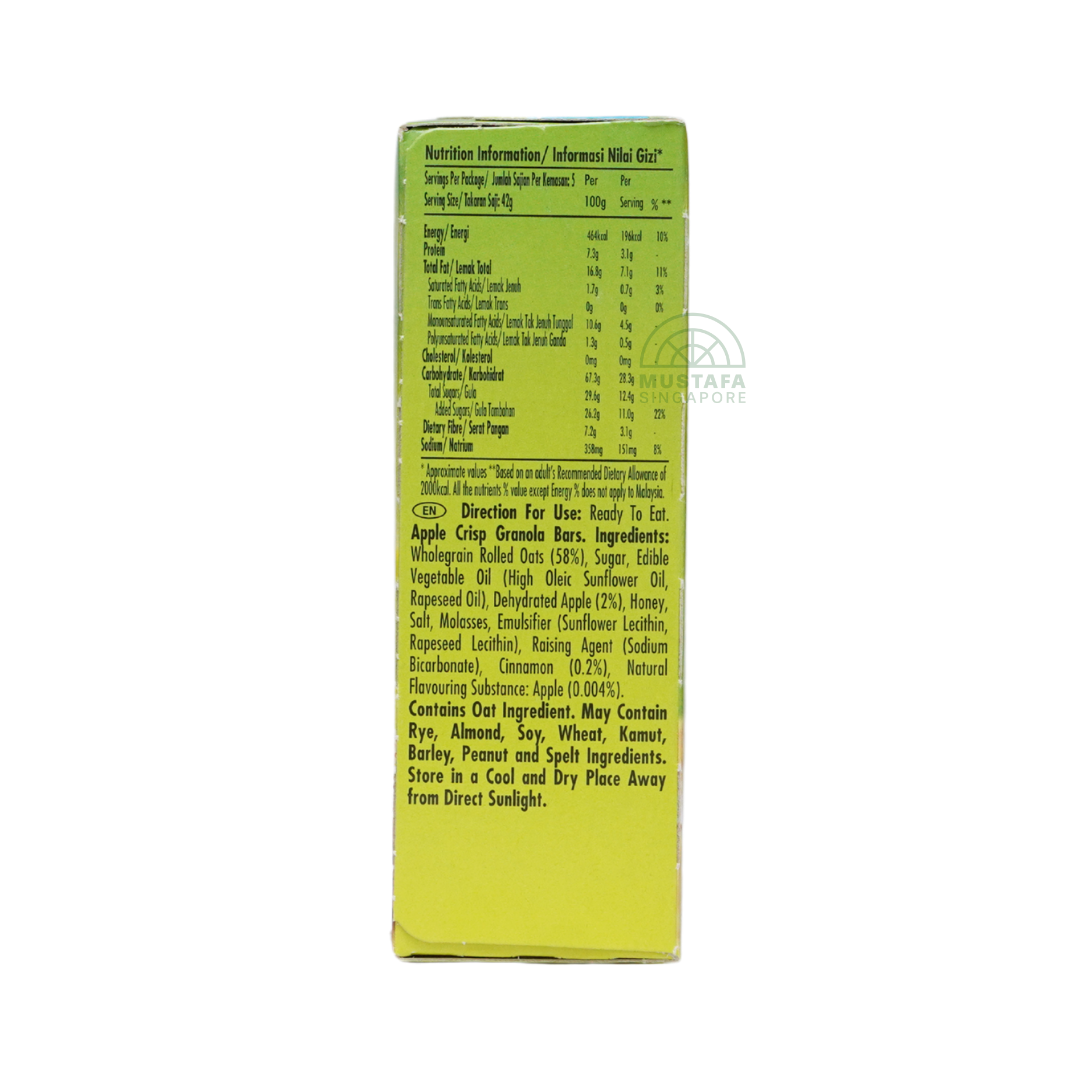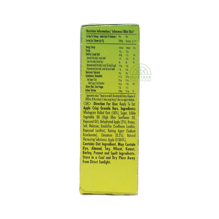 Wholegrain Rolled Oats (58%), Sugar, Edible Vegetable Oil (High Oleic Sunflower Oil), Dehydrated Apple (2%), Honey, Salt, Molasses, Emulsifier (Sunflower Lecithin), Raising Agent (Sodium Bicarbonate), Cinnamon (0.2%), Natural Flavouring Substance: Apple (0.004%).