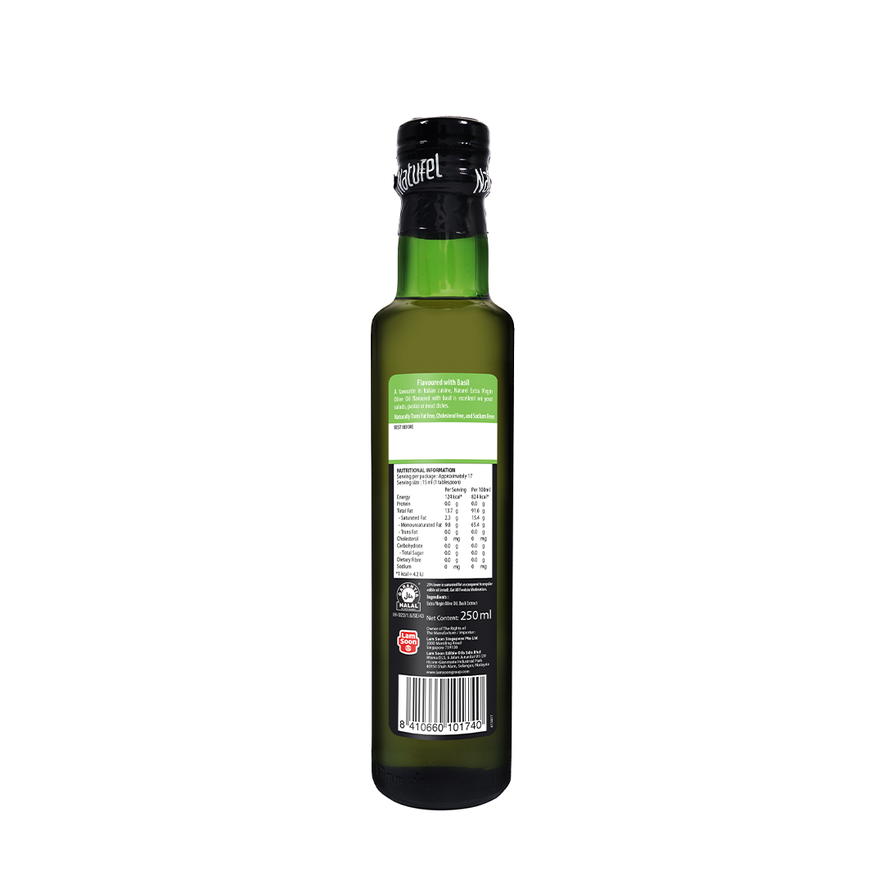 Naturel Basil Flavoured Extra Virgin Olive Oil 250ml is cold-pressed from premium olives and infused with natural basil extract. Ideal for salad dressings, drizzling over pasta, and enhancing the flavor of Mediterranean dishes.